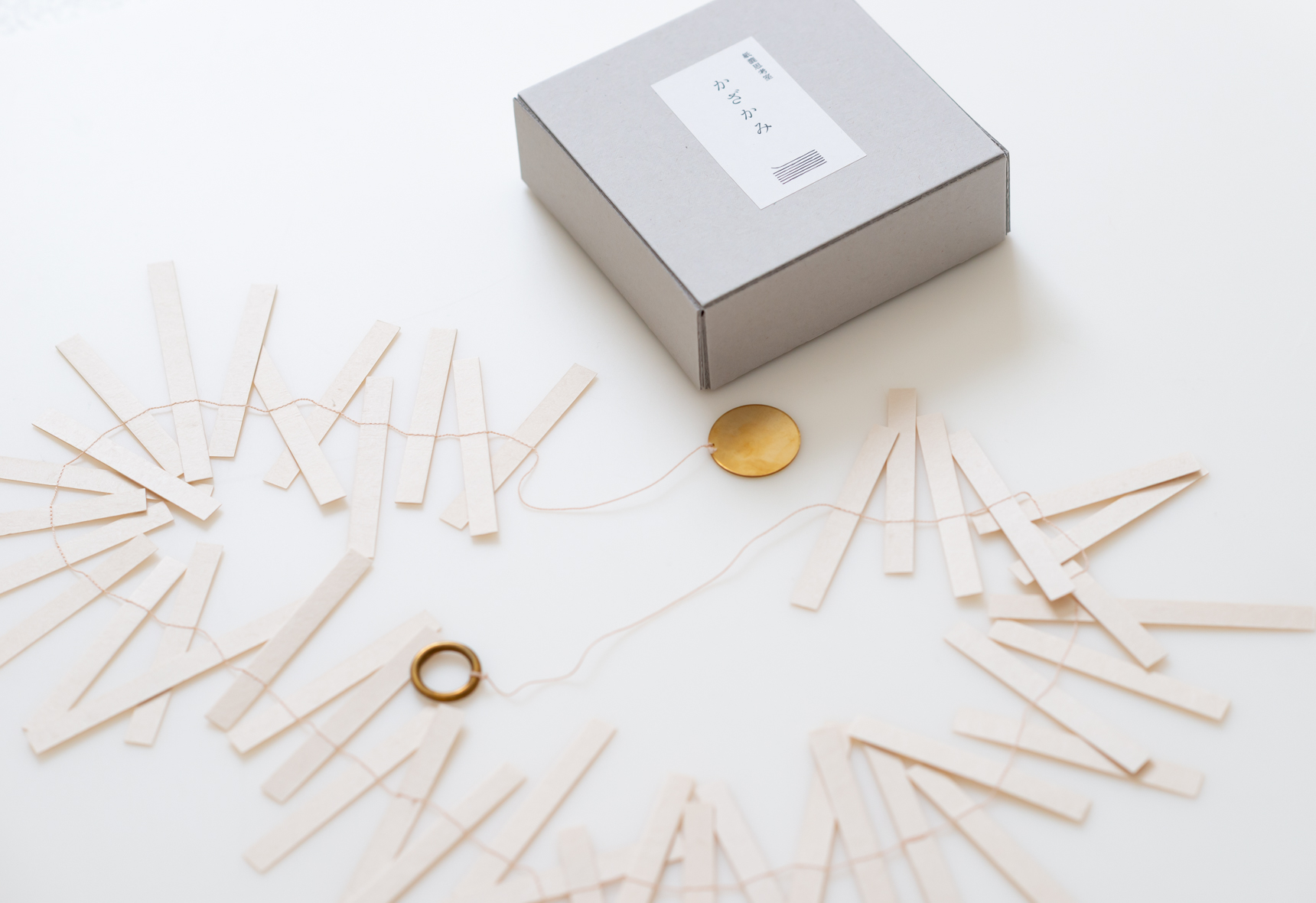 40枚ほどの長短の紙片が角度を変えて縫われており、上部には輪っかが、一番下には重しとして丸い真鍮が取り付けてあります。輪っか部分から下の丸い真鍮までの長さは約110cmですが、吊り下げる高さを調整したいときは、テグスなどを使って簡単に伸ばすこともできます(テグスはご用意ください)