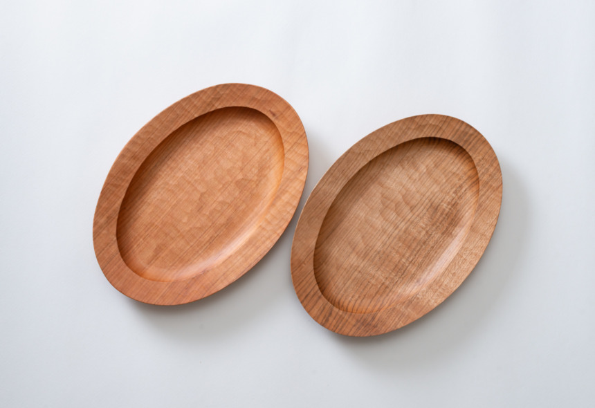 reedから車で10分ほどの山麓にある山口 和宏さんの工房。そのおおらかな人柄からも想像できる、手彫りのノミ跡が温かい雰囲気のオーバル皿です。