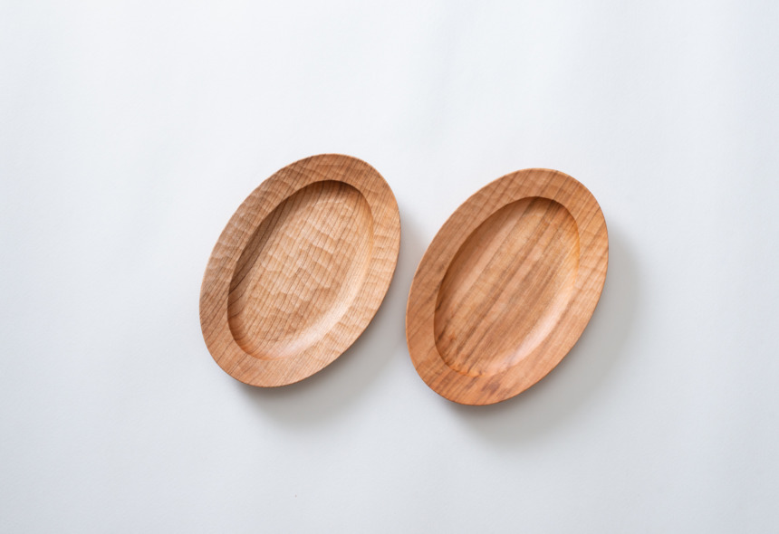 リムの立ち上がりがとてもきれいで、表面には自家製の蜜蝋ワックスを塗って仕上げています。今回入荷したのは明るい色調が美しい山桜(スライド写真の木材は胡桃です)。