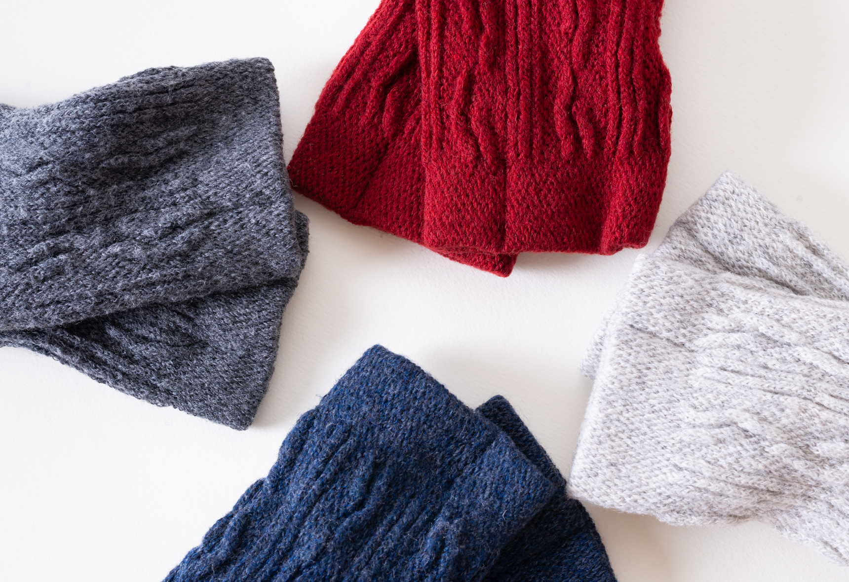 実際に手を通すとチクチクとした感じは全くなく、どちらかというとしっとりとした感触で、長時間付けても気になりません。また、見た目も袖口からちらっと見える編み込みのセーターのようで、手元の可愛らしいアクセントになると思います。お洗濯はウールを贅沢に使用しているため、手洗いしてください。