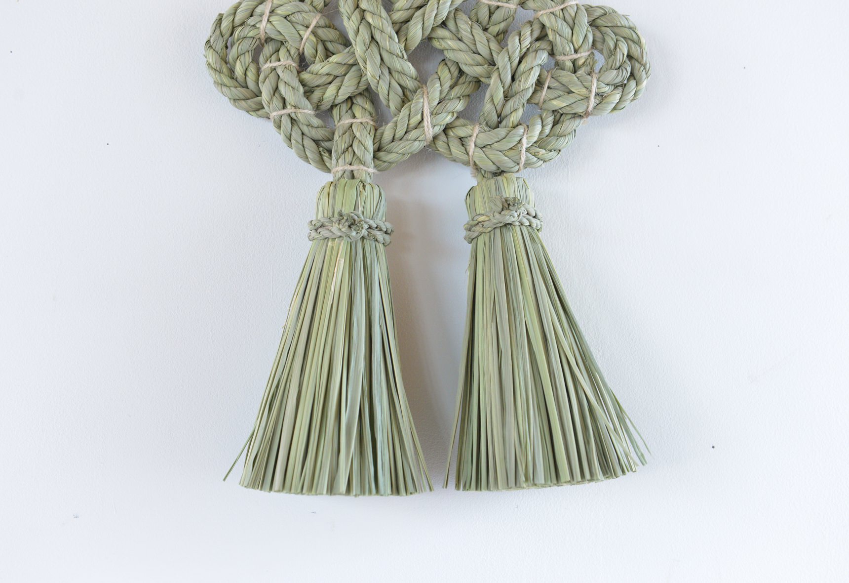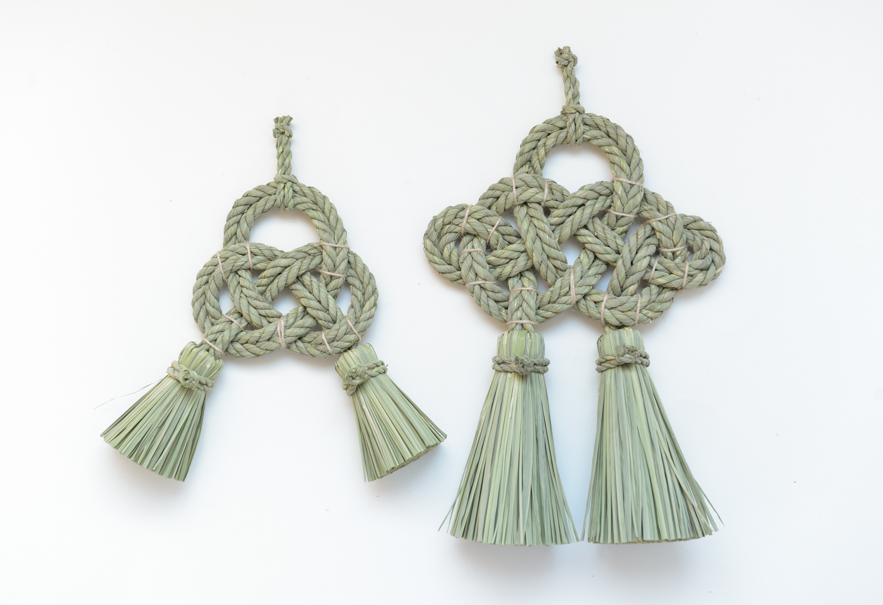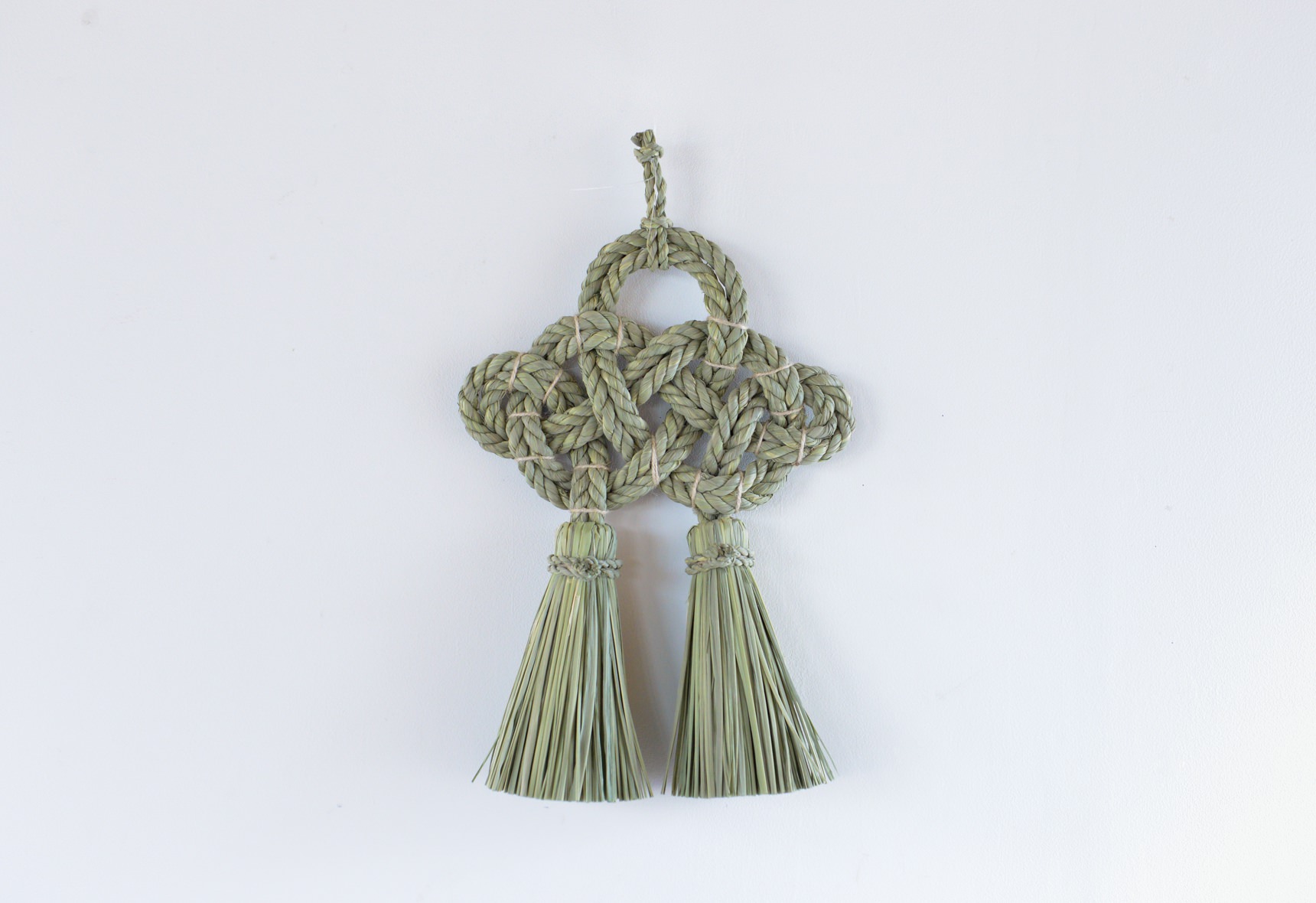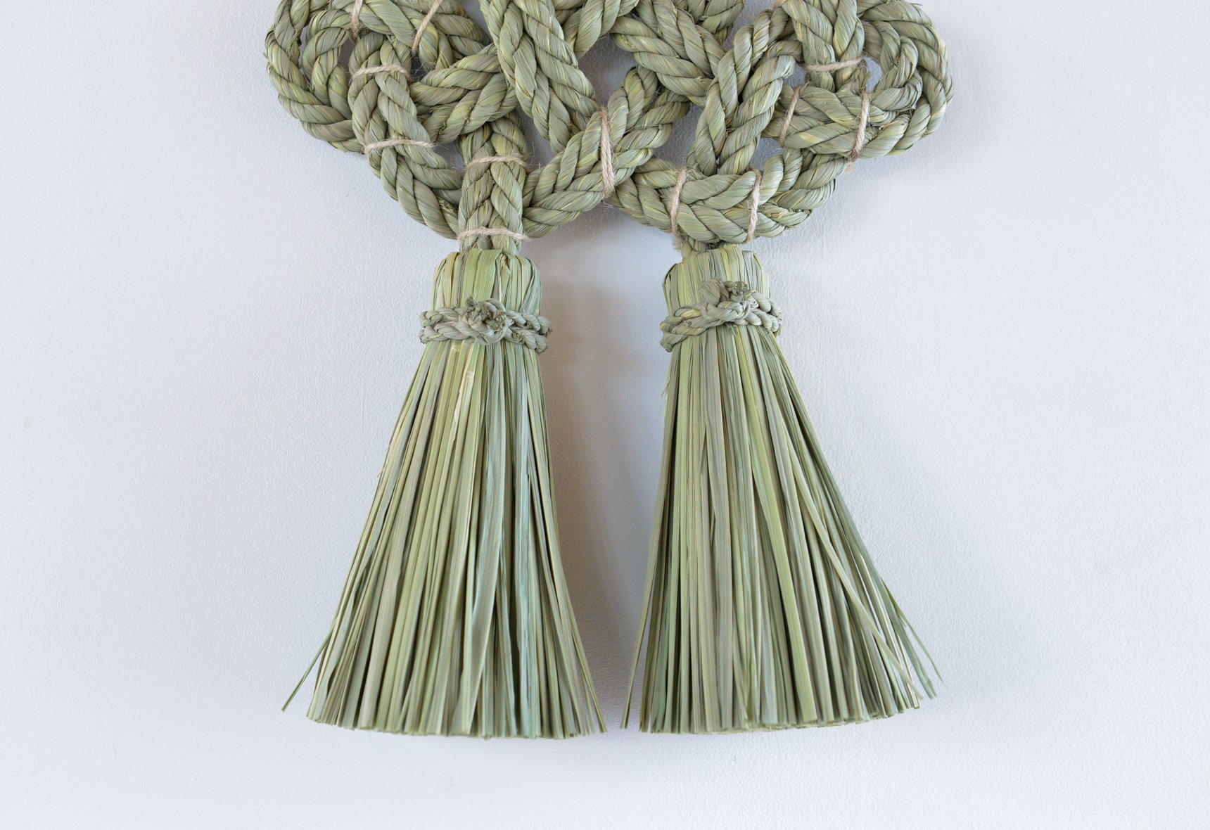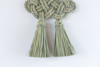 こちらの”湯襷(ゆだすき)”は、もともと産婆さんがお産の際にかけていた着物の襷掛けの結び方をわら縄で表現したもので、家内安全だけでなく子宝安産豊穣の願いも込められています。素材となる藁は田植えから稲刈りまで自らの手で行い、機械が一般的な刈り入れも手作業で行うことで、編み上げた際に縁起物としてふさわしい仕上がりになるそうです。