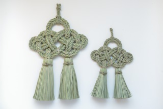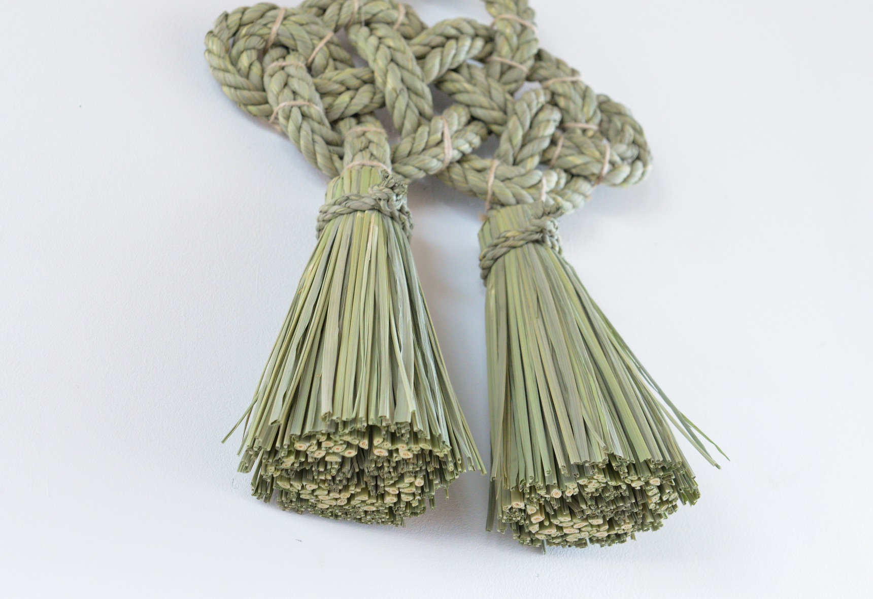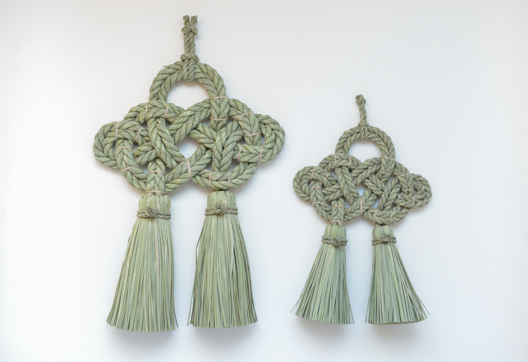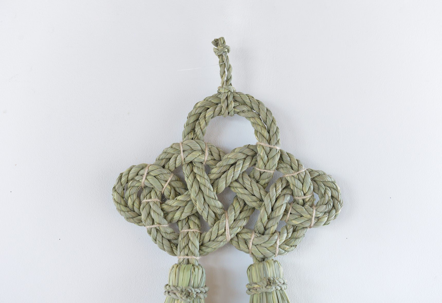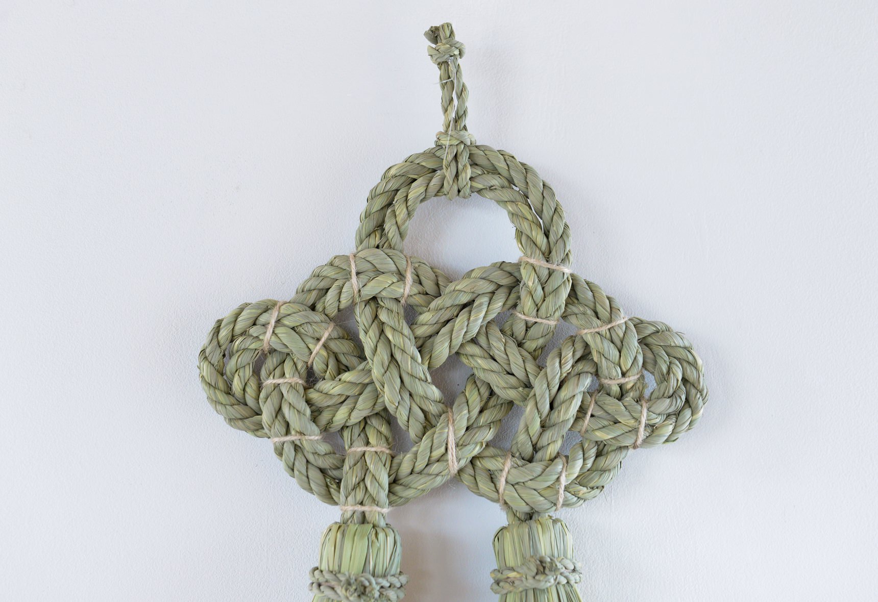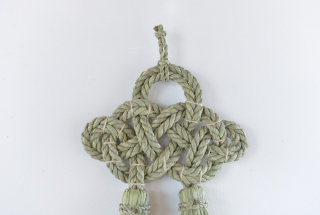 こちらの”湯襷(ゆだすき)”は、もともと産婆さんがお産の際にかけていた着物の襷掛けの結び方をわら縄で表現したもので、家内安全だけでなく子宝安産豊穣の願いも込められています。素材となる藁は田植えから稲刈りまで自らの手で行い、機械が一般的な刈り入れも手作業で行うことで、編み上げた際に縁起物としてふさわしい仕上がりになるそうです。
