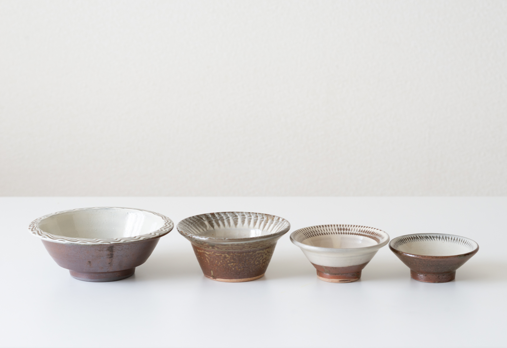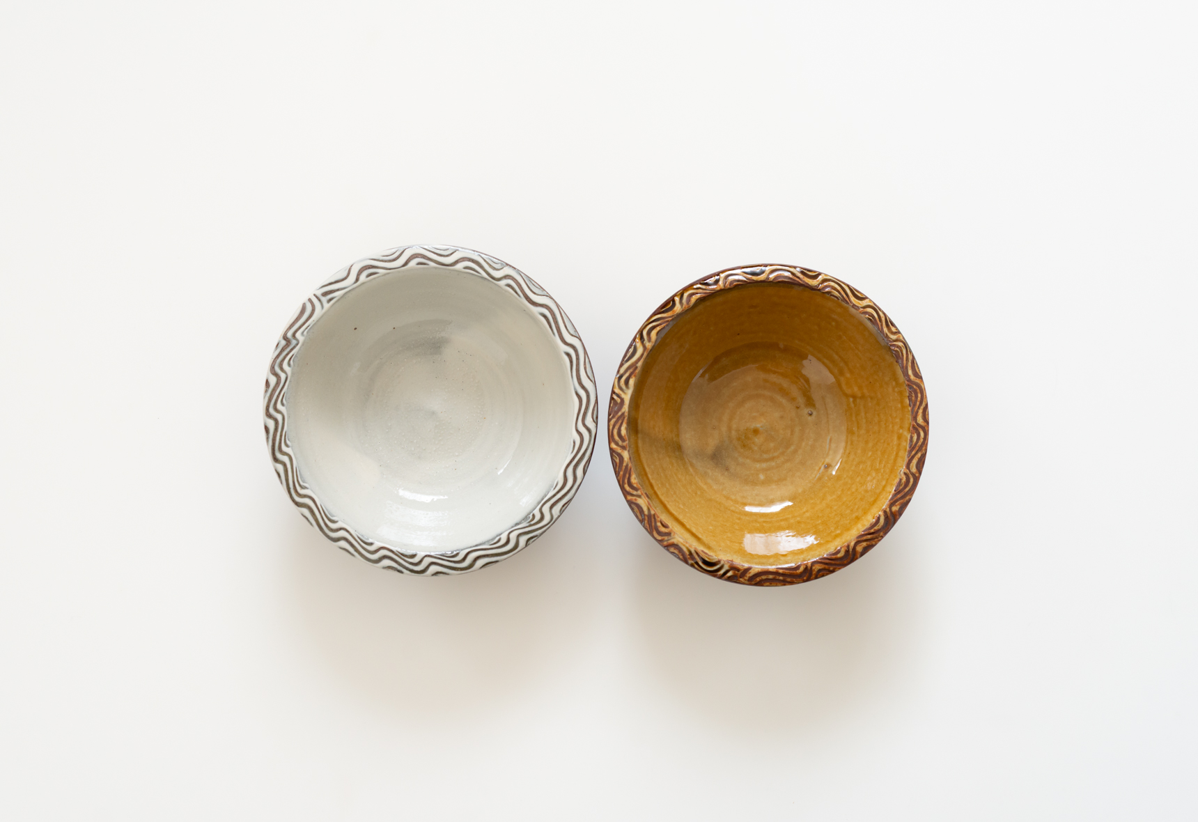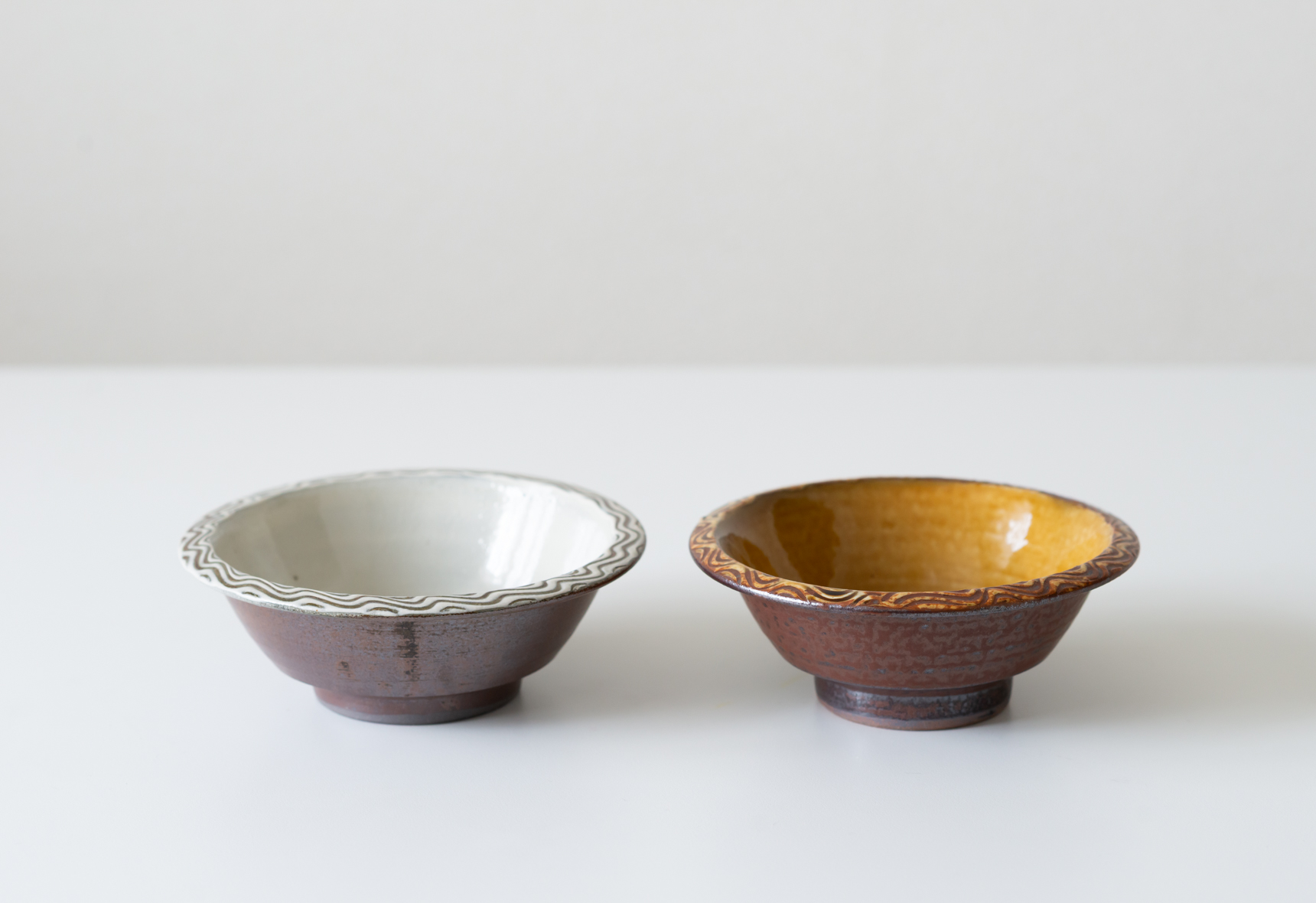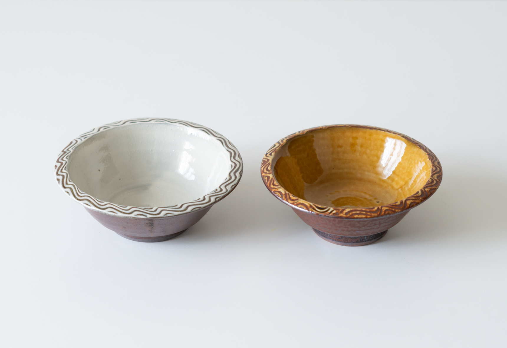 温かみのある飴釉と灰色がかった白の2色で展開している縁付小鉢は、すっきりとした形と縁周りに施された櫛目模様がアクセントになっています。