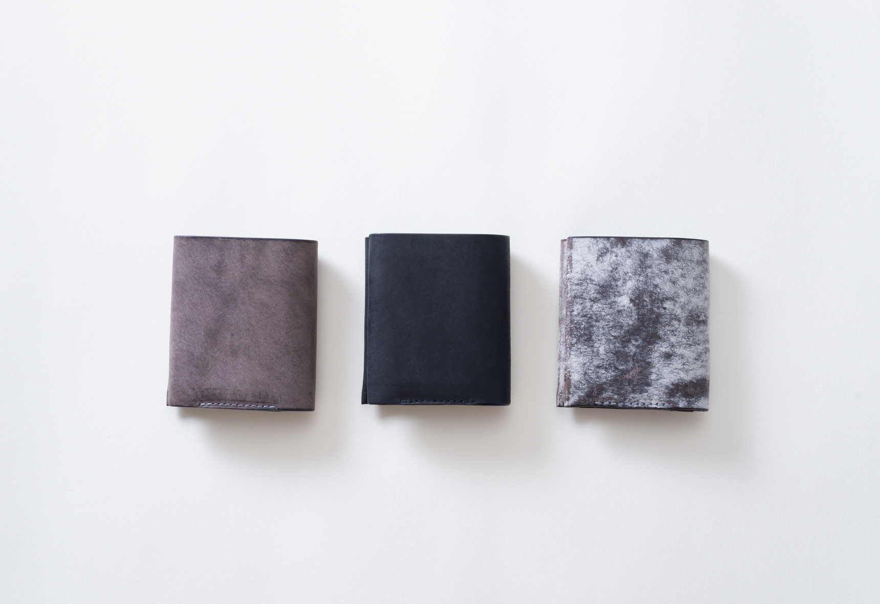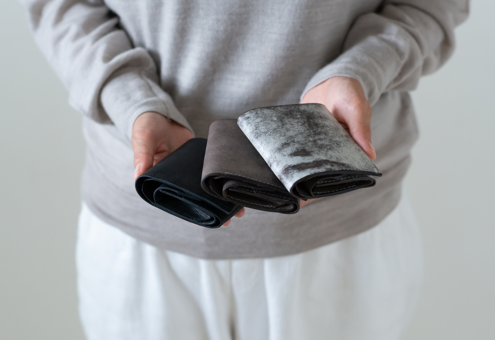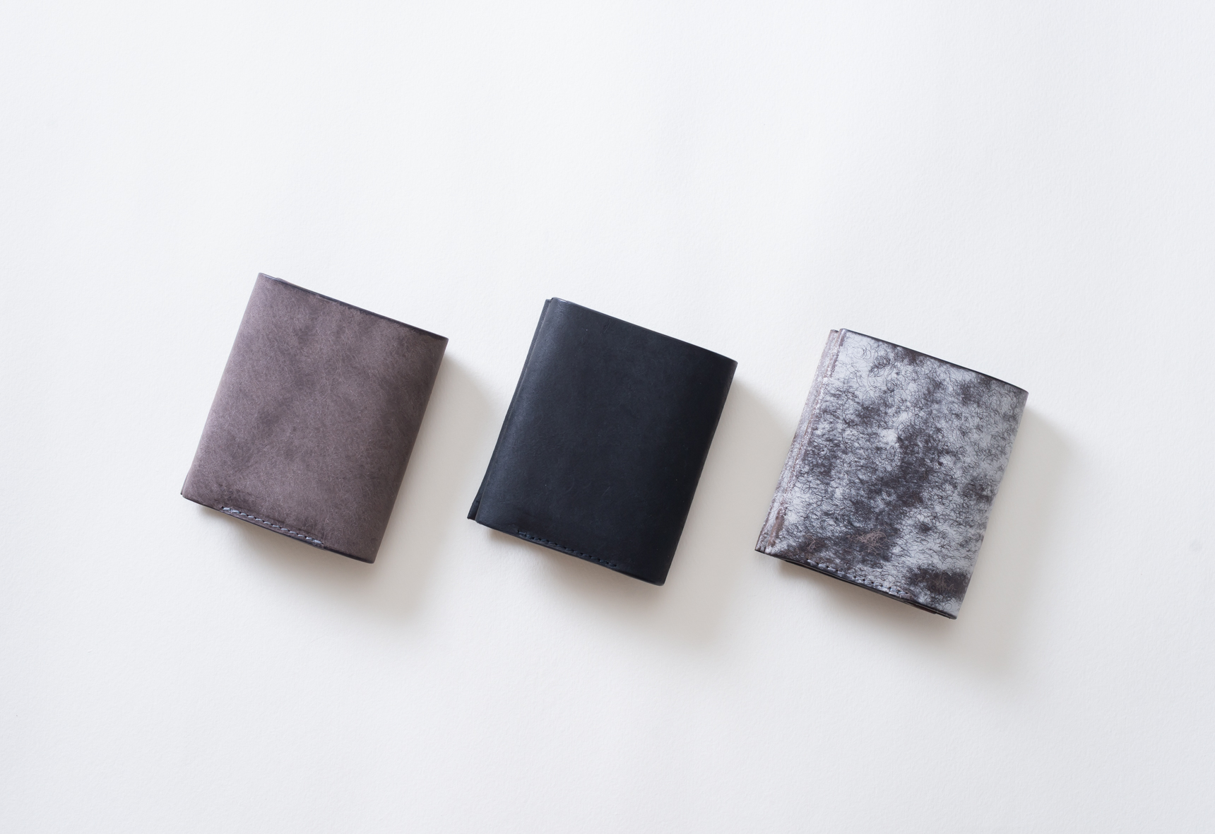 左からグレー(sold)・ブラック・ミストグレーの3色展開となります。自然素材のため色の出方や皺の入り方に多少の個体差が生じる点、あらかじめご承知ください。
