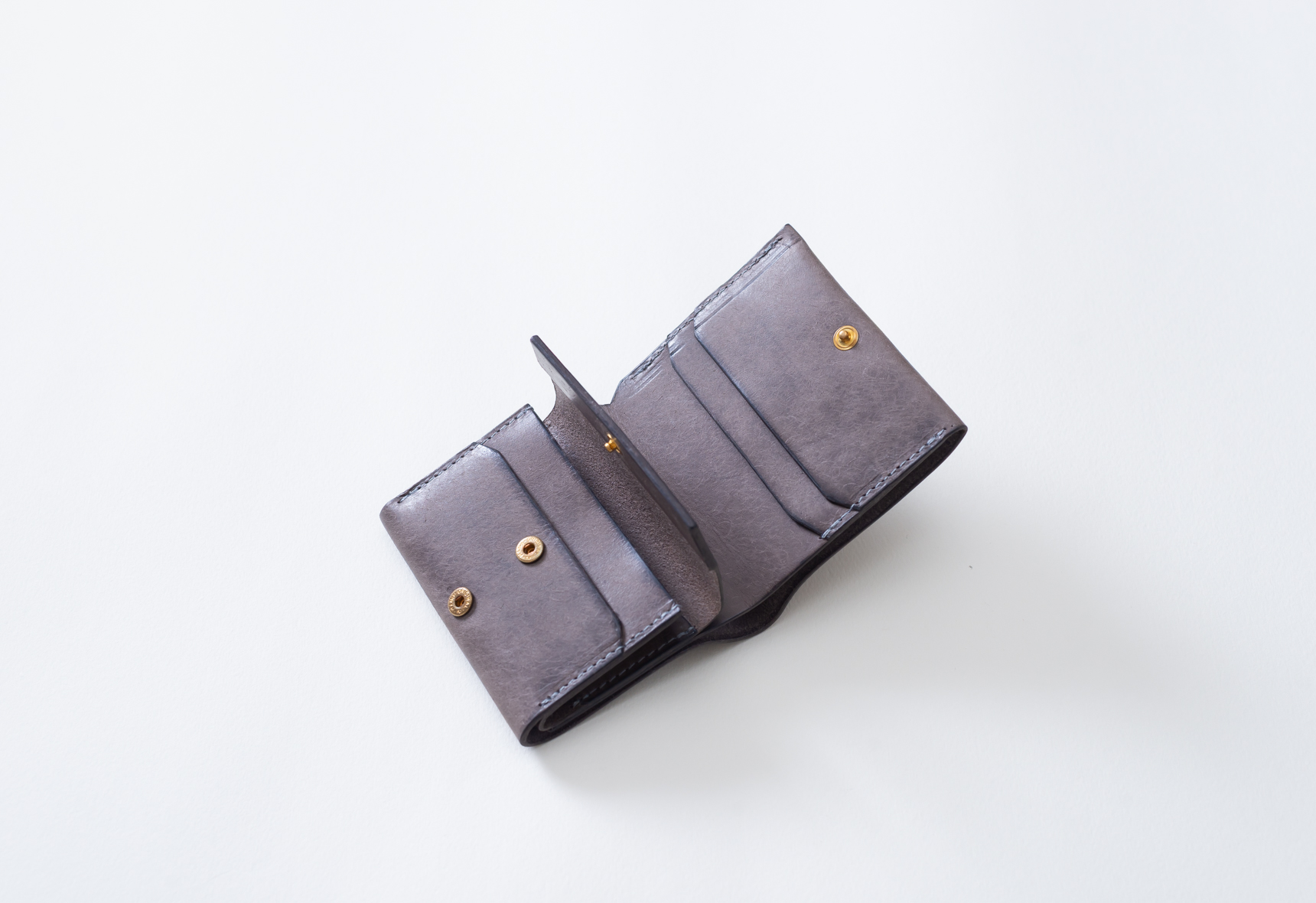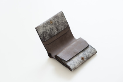 自宅で長く使っている長財布。時間をかけてゆっくりとオイルを染み込ませていく植物タンニン鞣しの革は、使うほどに自然と艶を帯びてゆきます。黒は色の変化はほぼありませんが、グレー、ミストグレーはやや茶色がかった色合いに変化していきます
