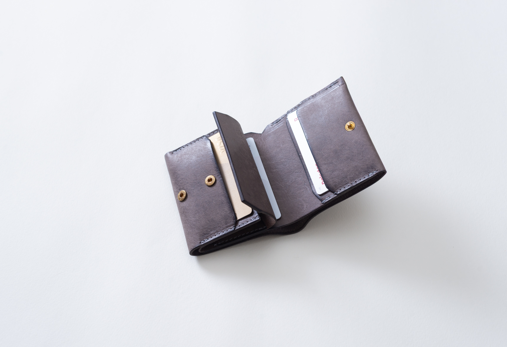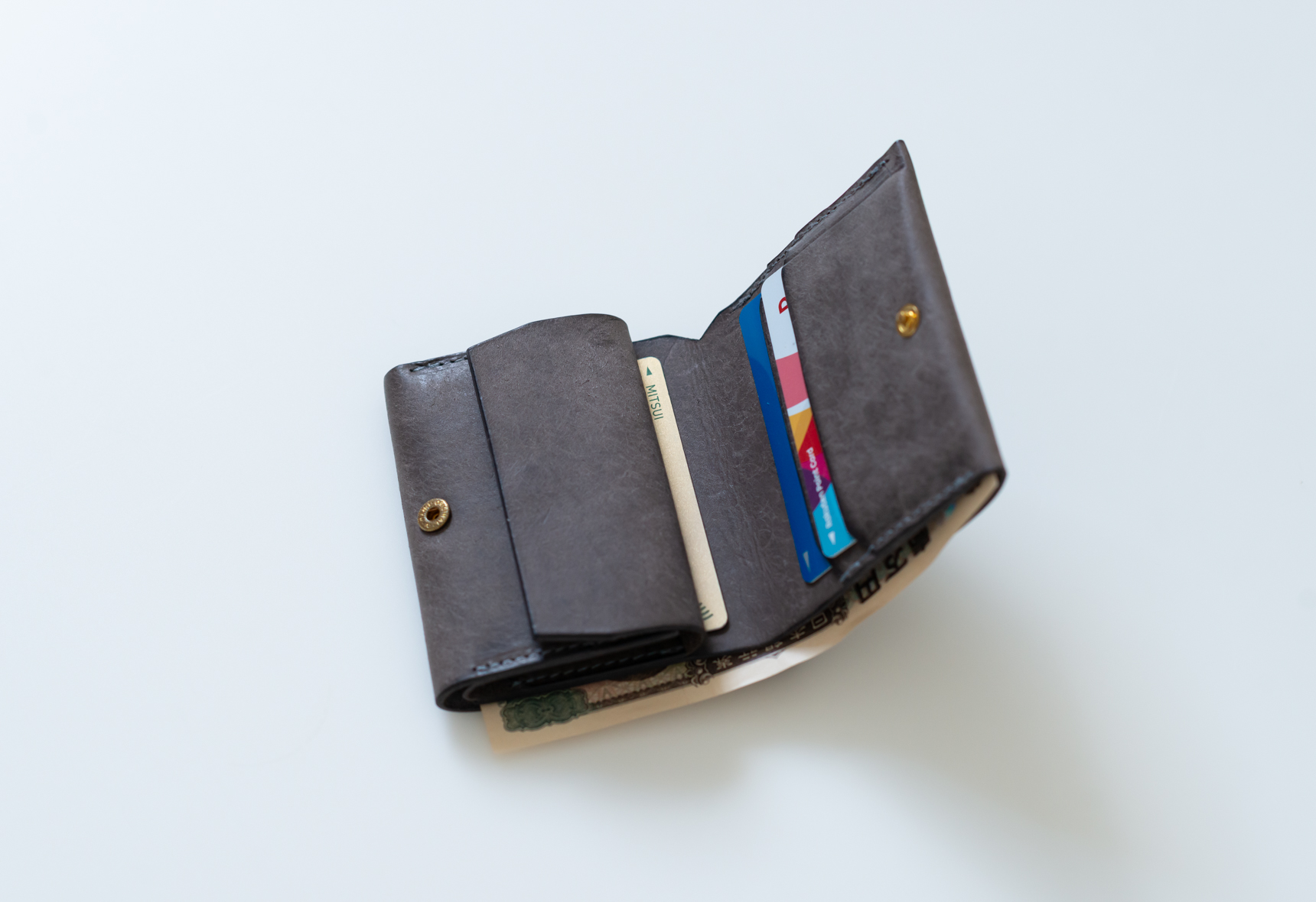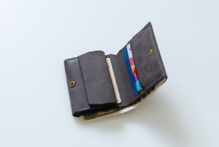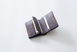 三つ折り財布と比べ一回りコンパクトなサイズ。厚みも抑えてあるので、ポケットに入れても違和感なく携帯できます。