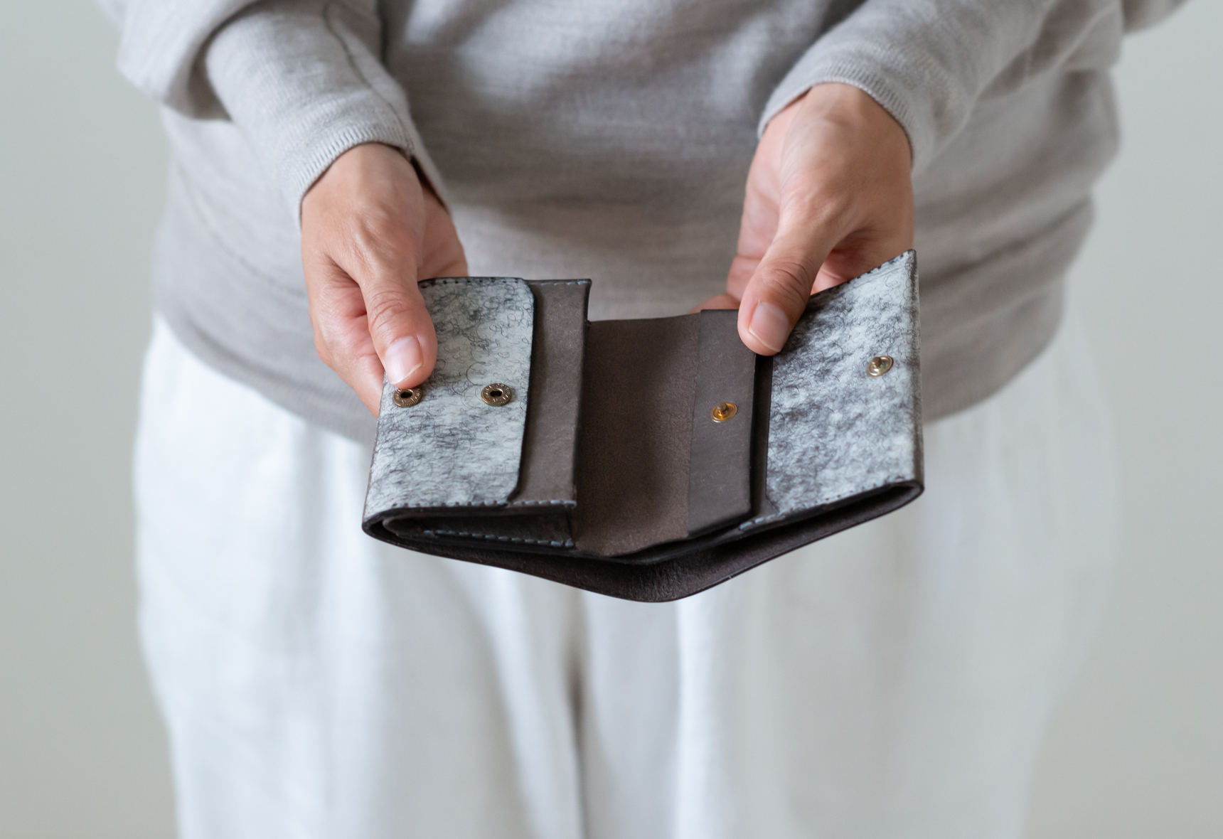 外装はすっきりとした佇まいに見えるようホックを表に付けていませんが、指の腹で軽くおさえると、内側のホックがパチンと気持ちよく留まります。男性でポケットに入れて持ち運びたい方にもおすすめの形です。