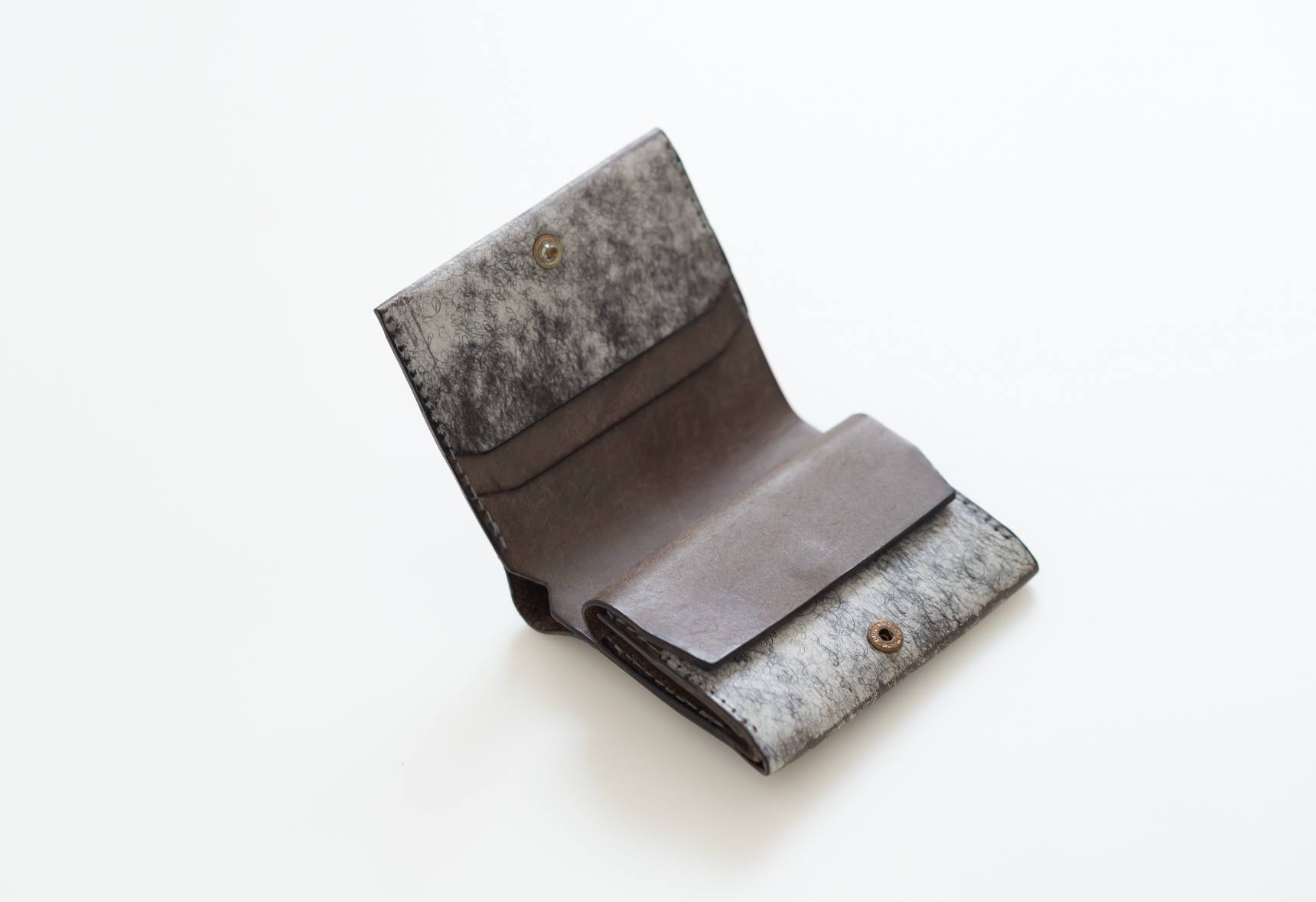 こちらの色は革を鞣したのち天然ワックスを表面に塗りこむことで、うっすら霧がかったような色合いが生まれます。もともと革についていた皴や血管のあとによって表情に個体差が出やすくなる点、あらかじめご承知ください。