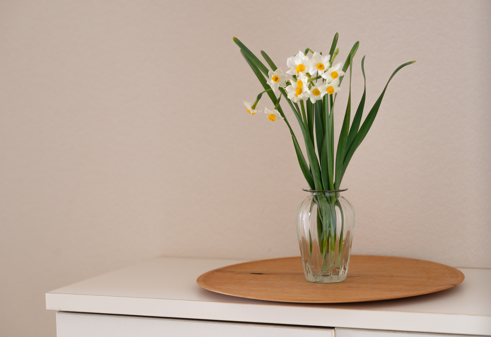 こちらは一輪挿しよりもやや背の高い花瓶。側面のモールはガラスならではのゆらぎがあり、あたたかみを感じます。