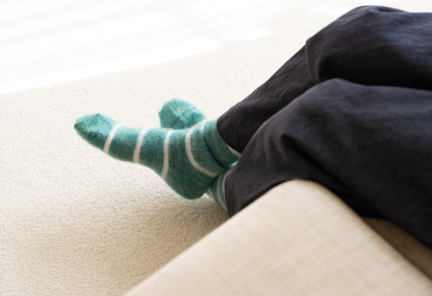 こちらは生後一年以内のアンゴラ山羊のモヘアとウールを混紡した糸を使用した一足。モヘアはやわらかく保温性があり、ウールとブレンドすることで薄手でもあたたかい靴下に仕上がっています。両面が起毛しているのでふわっとした風合いが魅力です。