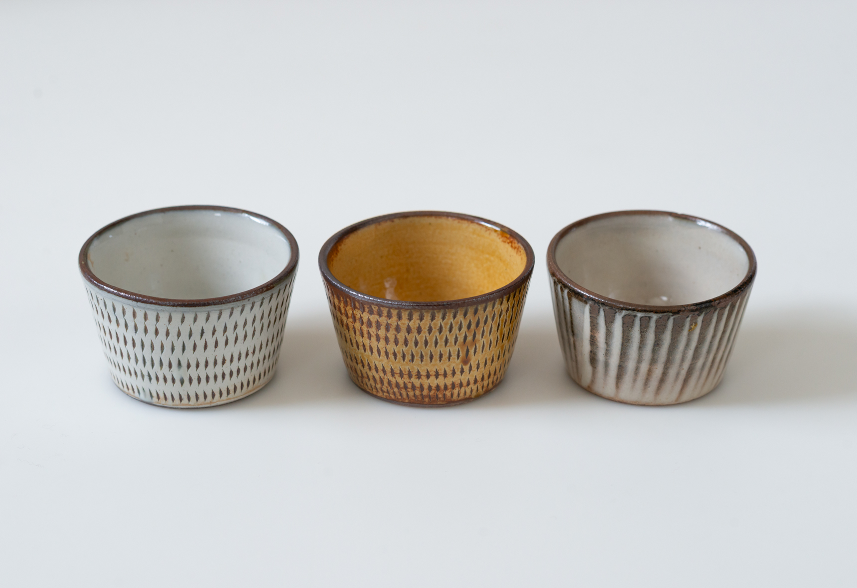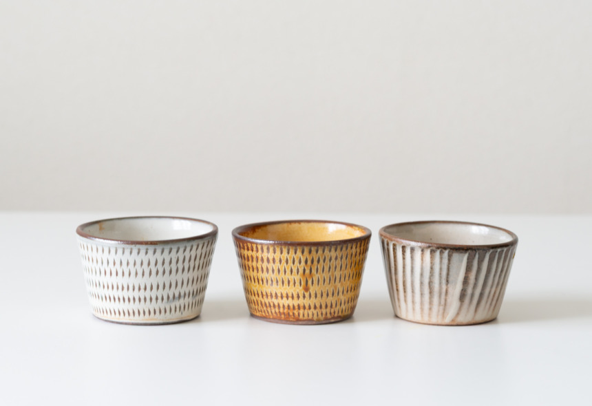 こちらは側面に小石原を代表する飛び鉋と刷毛目模様が施された切立鉢。高台が付いていないので、和食の小鉢としてだけでなくヨーグルトや果物を入れて使うにもちょうどよい形です。