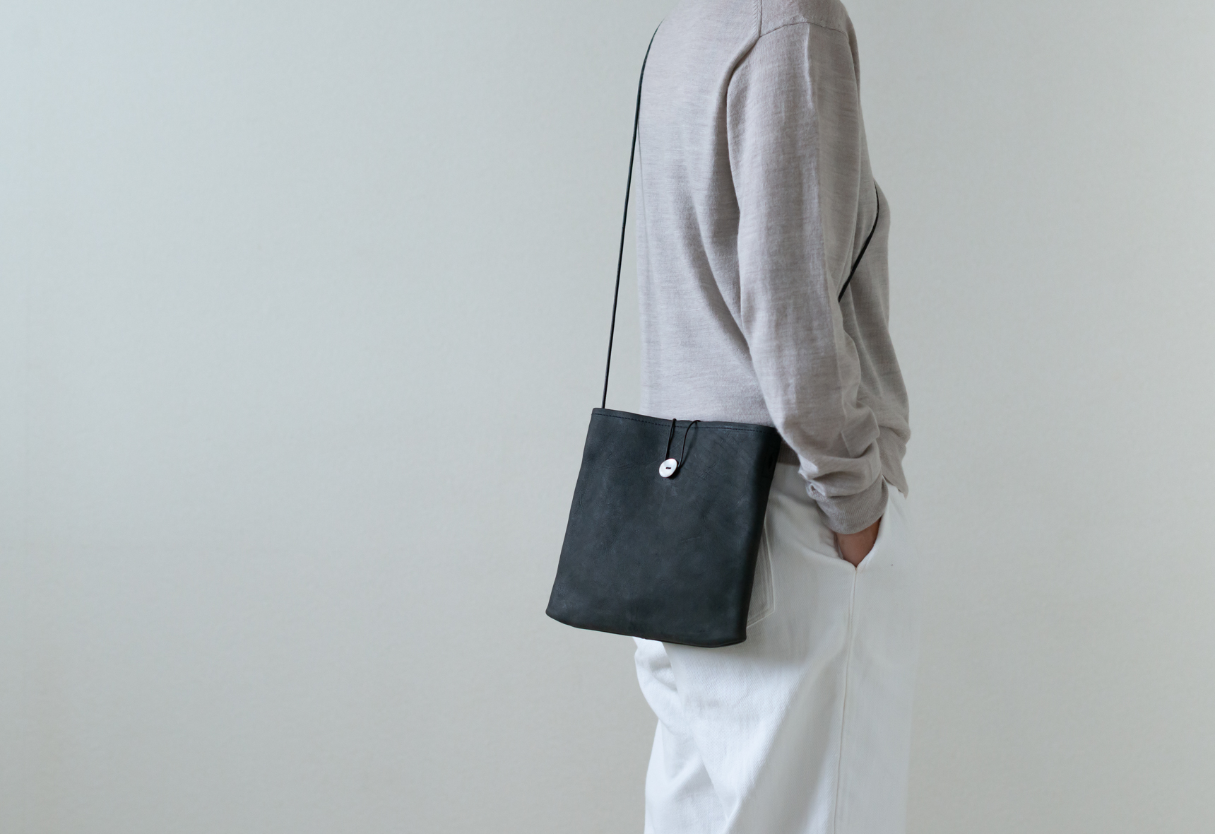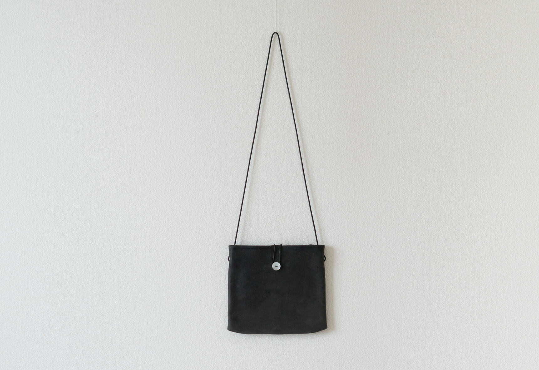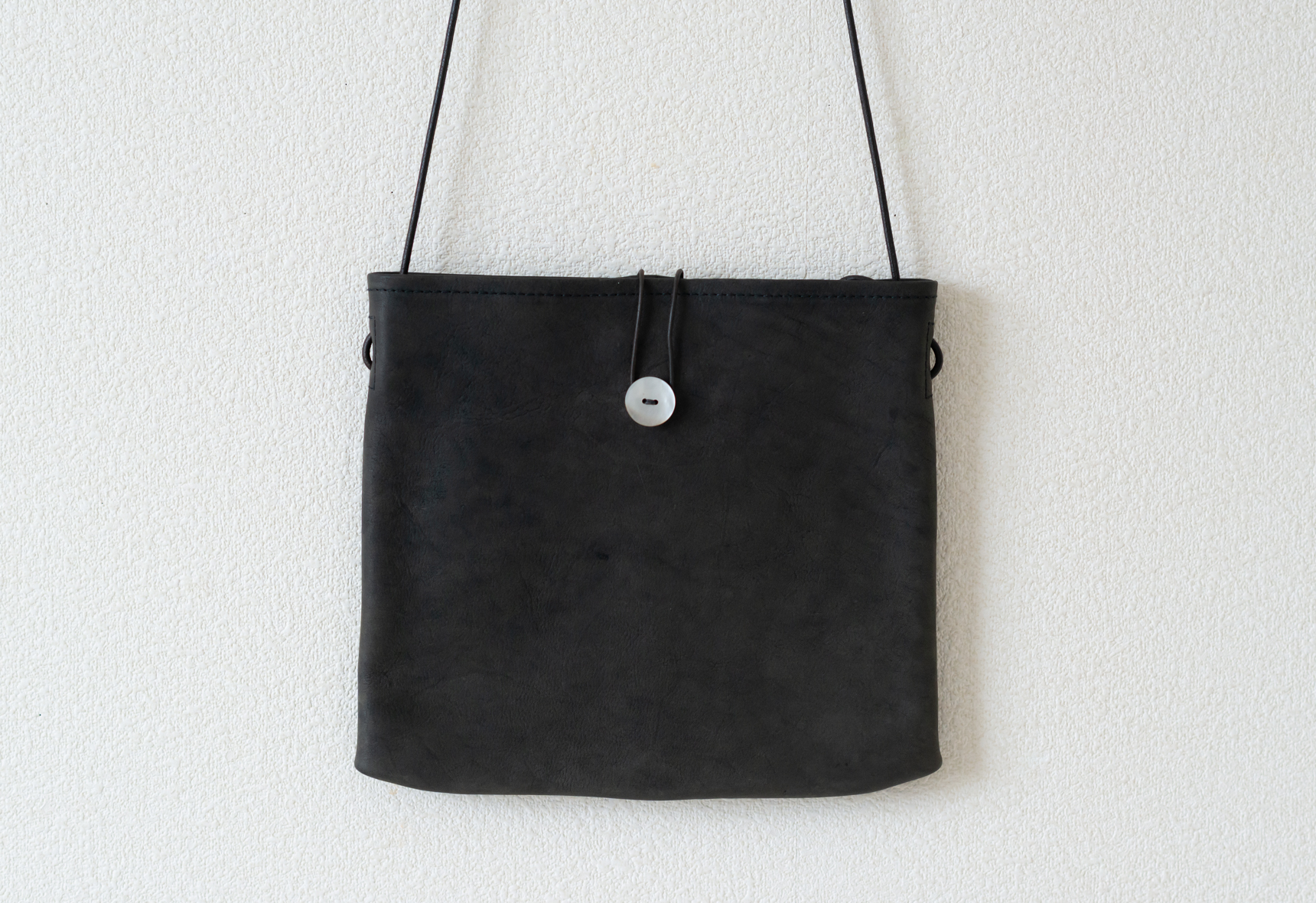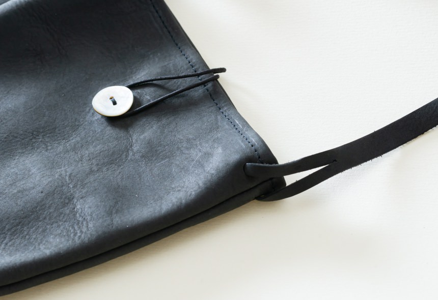 その革を長方形にカットし、無駄がでないようぐるりと巻いて裏側と底面をミシンで縫い合わせたのがこちらの形。構造は封筒のように簡易ですが、あれこれ手を入れていない分、素の美しさが引き立ちます。開閉は表についている20mmほどの貝ボタンに革紐をひっかける形。肩紐は直径3㎜ほどの革紐を使ってかばん内部で結べるようになっているので、身長にあわせてご調整ください(中にポケットはついてません)。