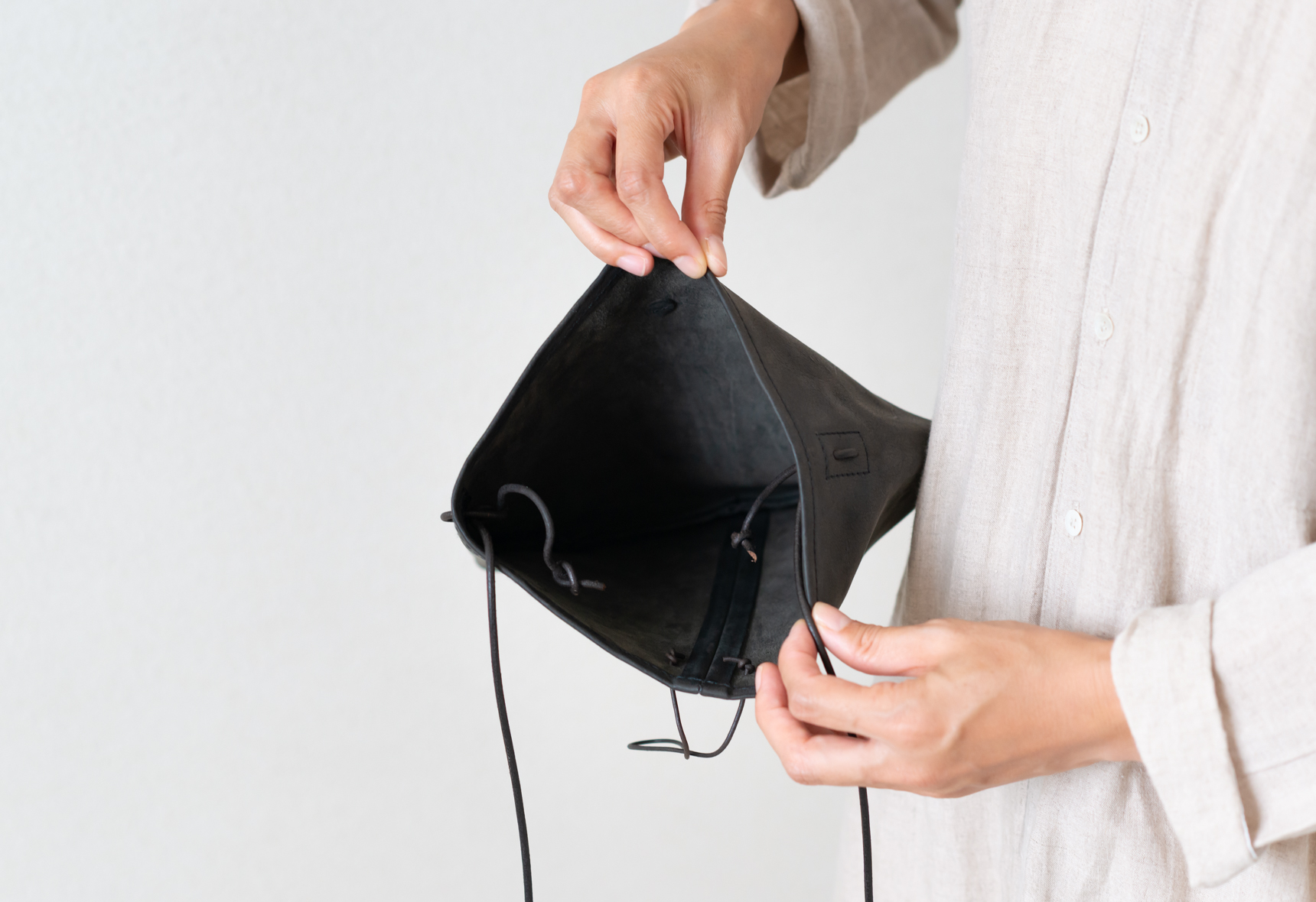 マチ幅は15mmほどとスリムな分、折り畳み財布と携帯、ポーチが入るくらいの大きさ。収納力はさほどありませんが、大人が持ちあるきたい落ち着いた雰囲気のかばんです。