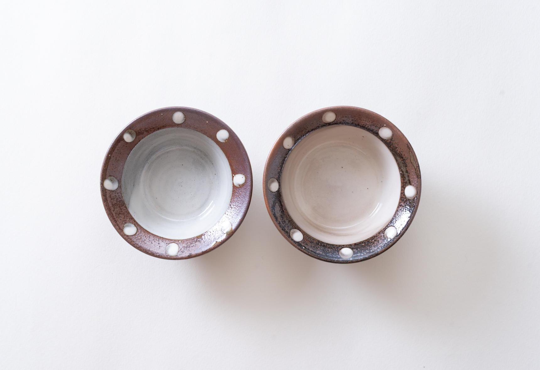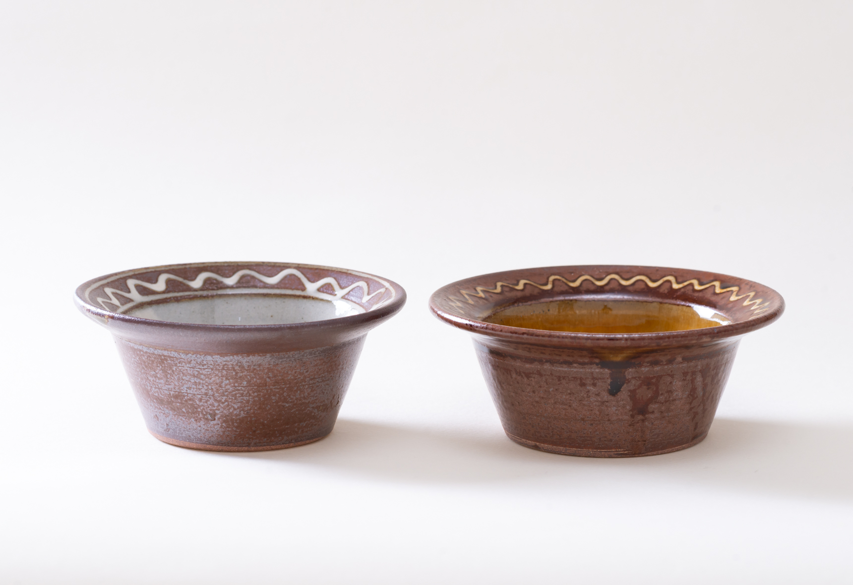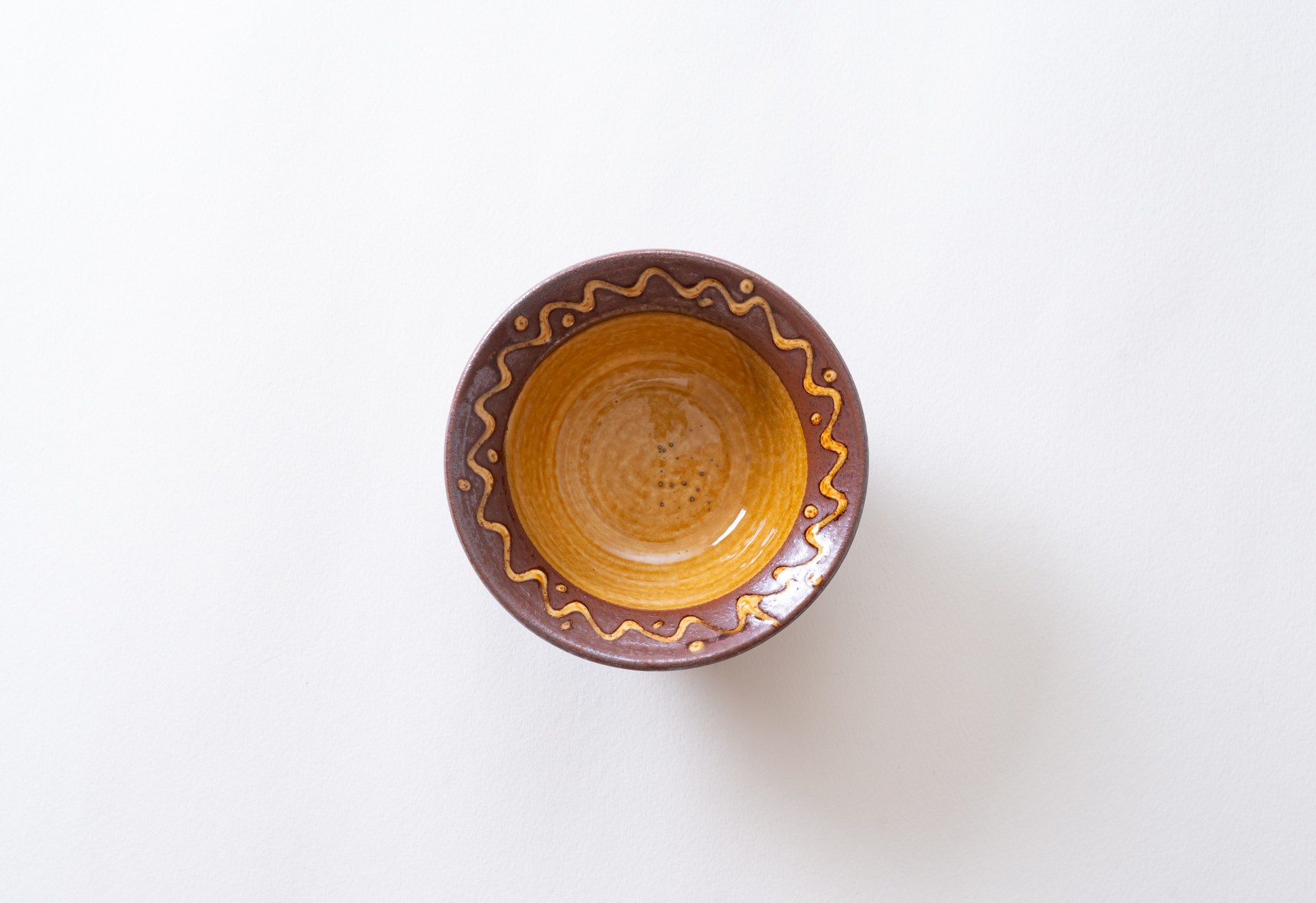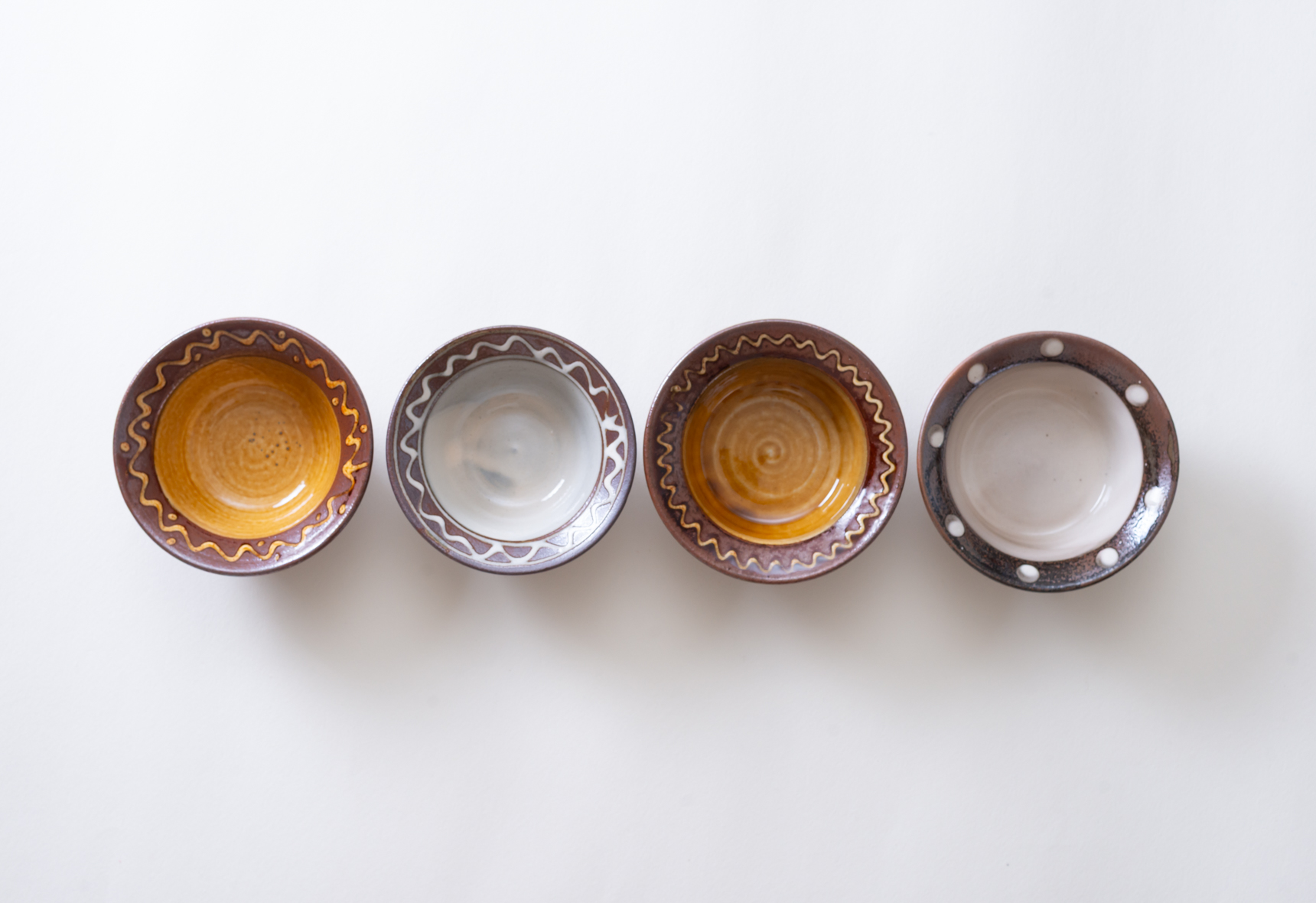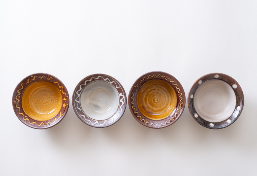 直径四寸ほどの深鉢は白と黄の釉薬を掛け、縁にポン描きと点打ちで模様を施したもの。白はやや灰色がかかった色合いで光沢感のある肌をしており、黄の方は所々に褐色の色合いが浮き出ています。