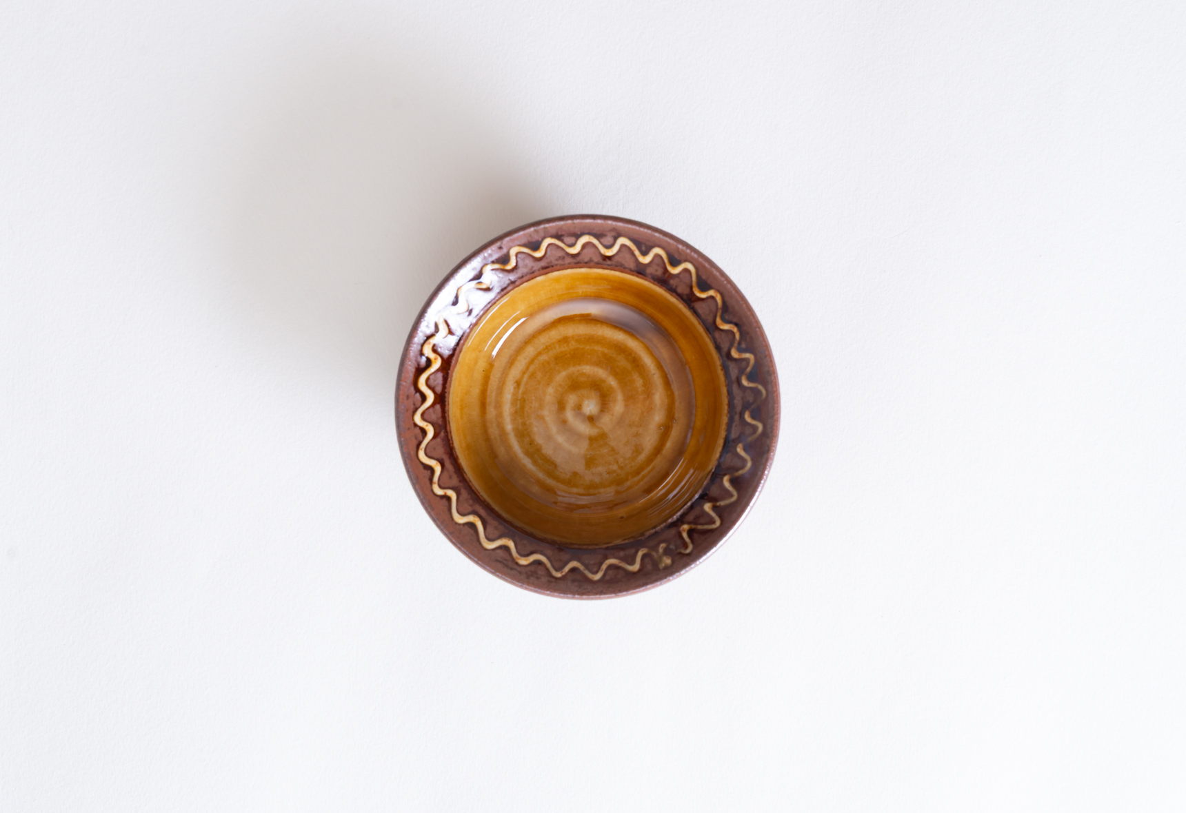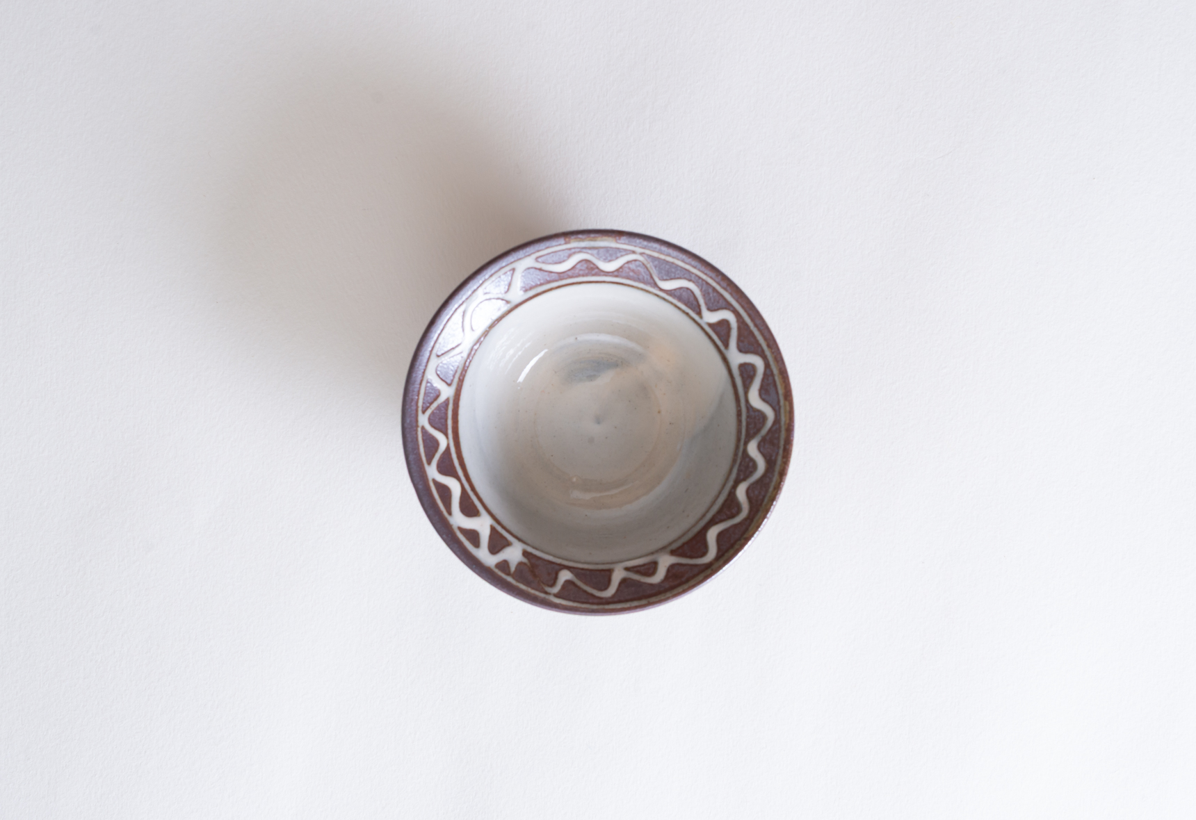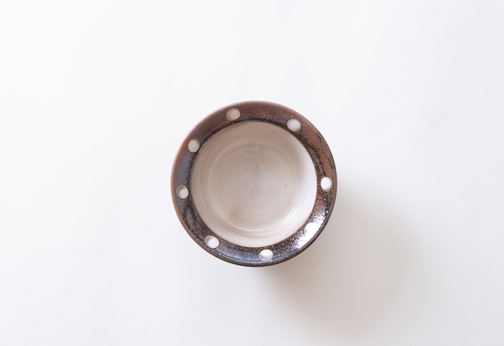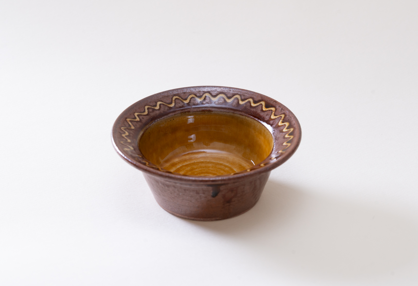 直径四寸ほどの深鉢は白と黄の釉薬を掛け、縁にポン描きと点打ちで模様を施したもの。白はやや灰色がかかった色合いで光沢感のある肌をしており、黄の方は所々に褐色の色合いが浮き出ています。