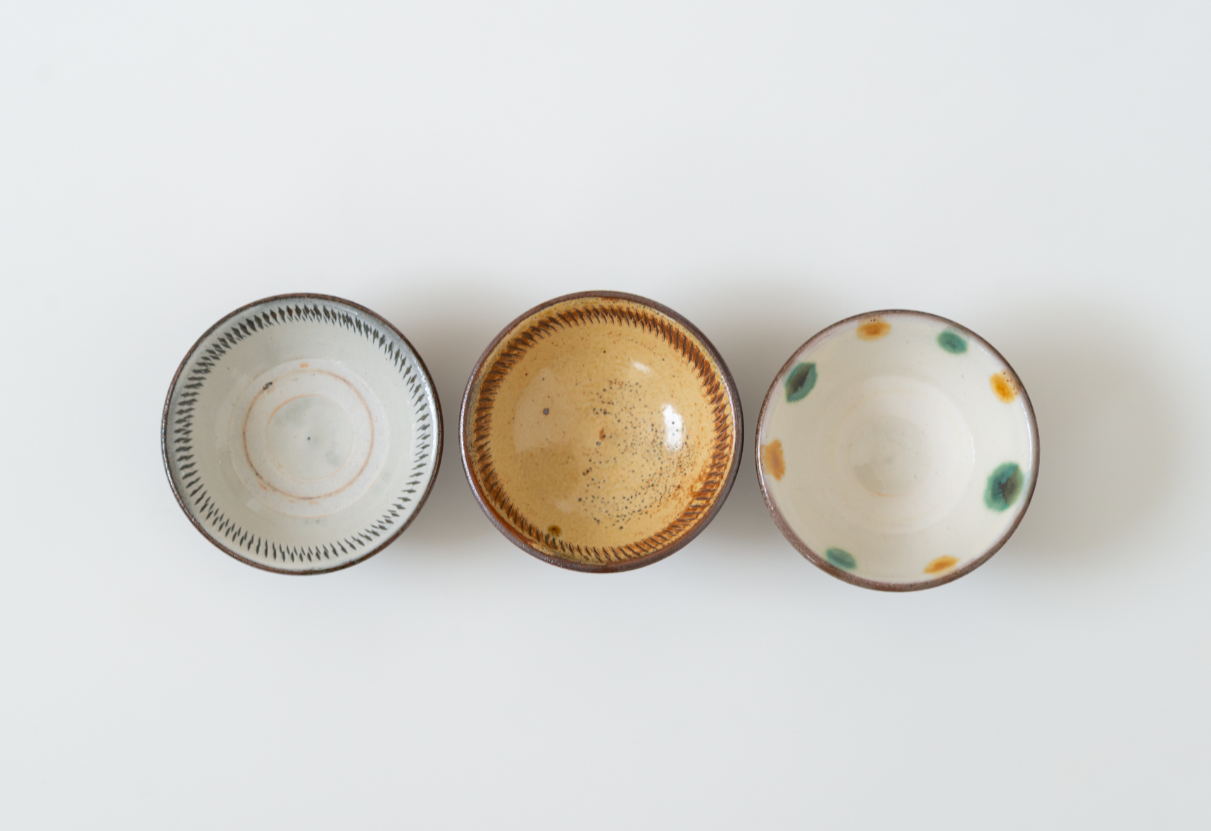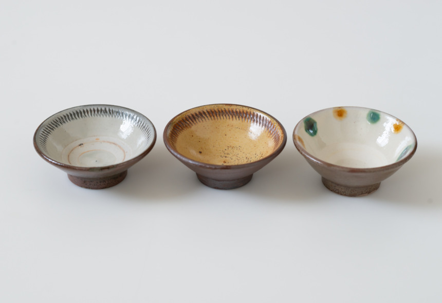 直径三寸ほどの豆鉢は白と黄の釉薬を掛け、縁に飛び鉋を施したもの。白はややマットな肌をしており、重ねて焼く際に釉薬をはぎ取ってできる蛇の目の跡がアクセントになっています。一方、黄の方は釉薬に光沢感があり、蛇の目はついていませんが飛び鉋模様が褐色に変化しています。