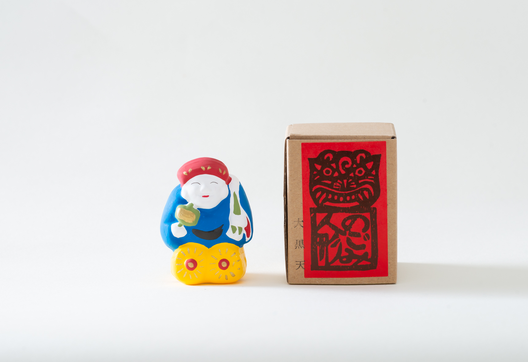 頭に大きな頭巾をかぶり、細い目でにっこり微笑む大黒天は七福神のひとり大黒様。右手には打ち出の小槌、背には大きな袋、米俵の上に立つ姿から財運や商売繁盛、五穀豊穣をもたらす神様として親しまれてきました。