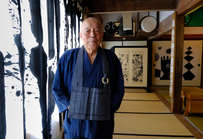 1941年 鳥取県気高町の長泉寺に生まれた正道さんは大学卒業後、曹洞宗大本山 總持寺にて禅の修行を行い、1976年 岡山県真庭市にある毎来寺に住職として入山されました。翌年より独学で板画を始め、本堂内の襖絵や天井画300点以上をご自身で制作。これまで国内だけでなくニューヨークやロサンゼルス、スペイン ジローナ市など海外でも個展を開催されています。