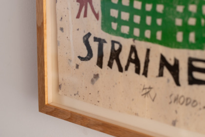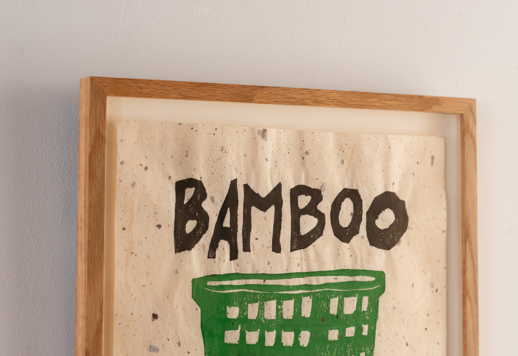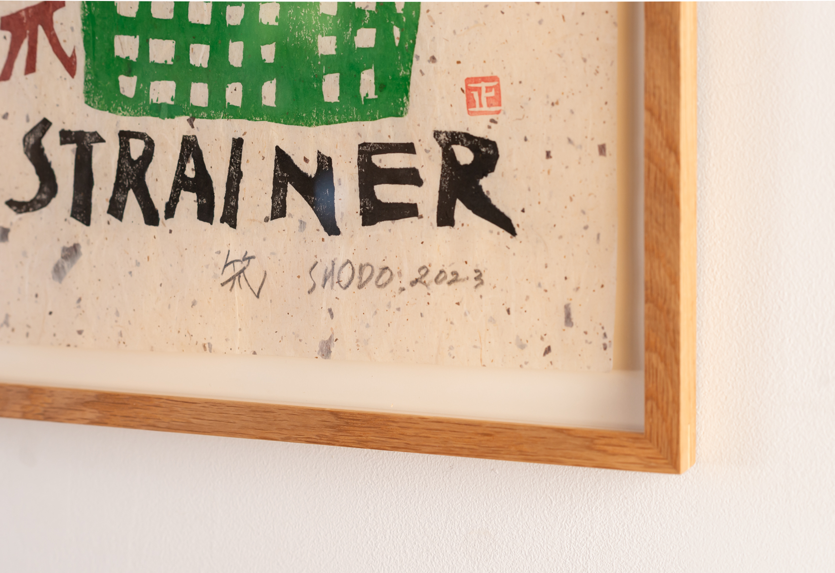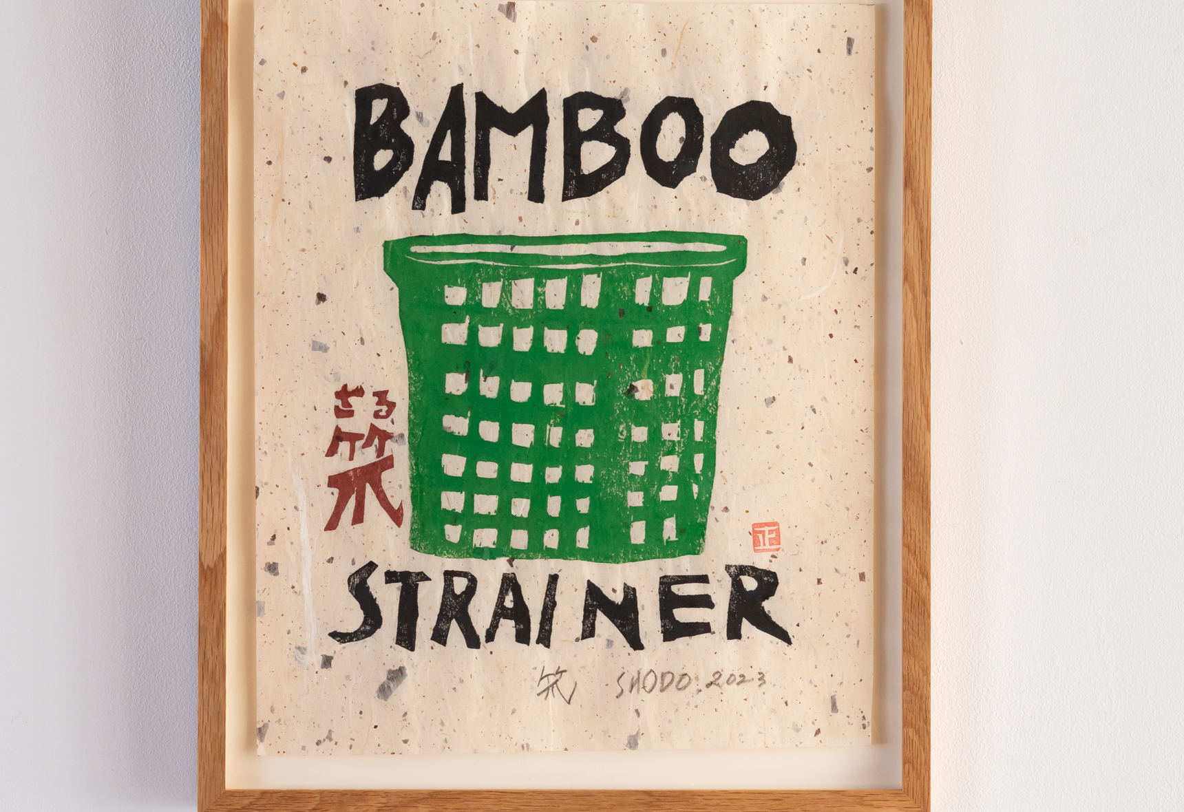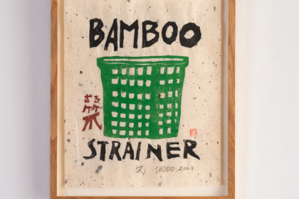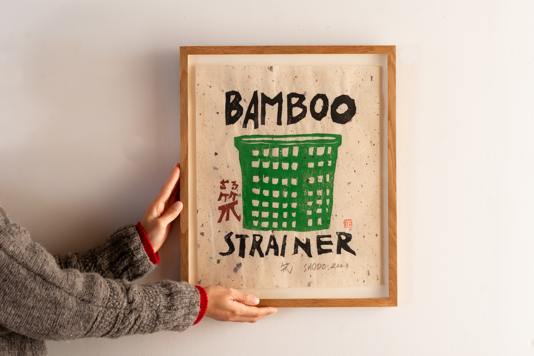 こちらは2023年に制作された竹で編んだ笊(ざる)をモチーフにした作品。正道さんは若い頃から民藝にも興味を持たれ、板画にもスリップウェアの陶器や蒜山の蒲細工など各地の手仕事を取り上げていらっしゃいます。単純化された笊の造形と上下に彫られた英字の風合いは手彫りの版木ならではの温かみを感じさせ、鮮やかな緑が目を惹きます。