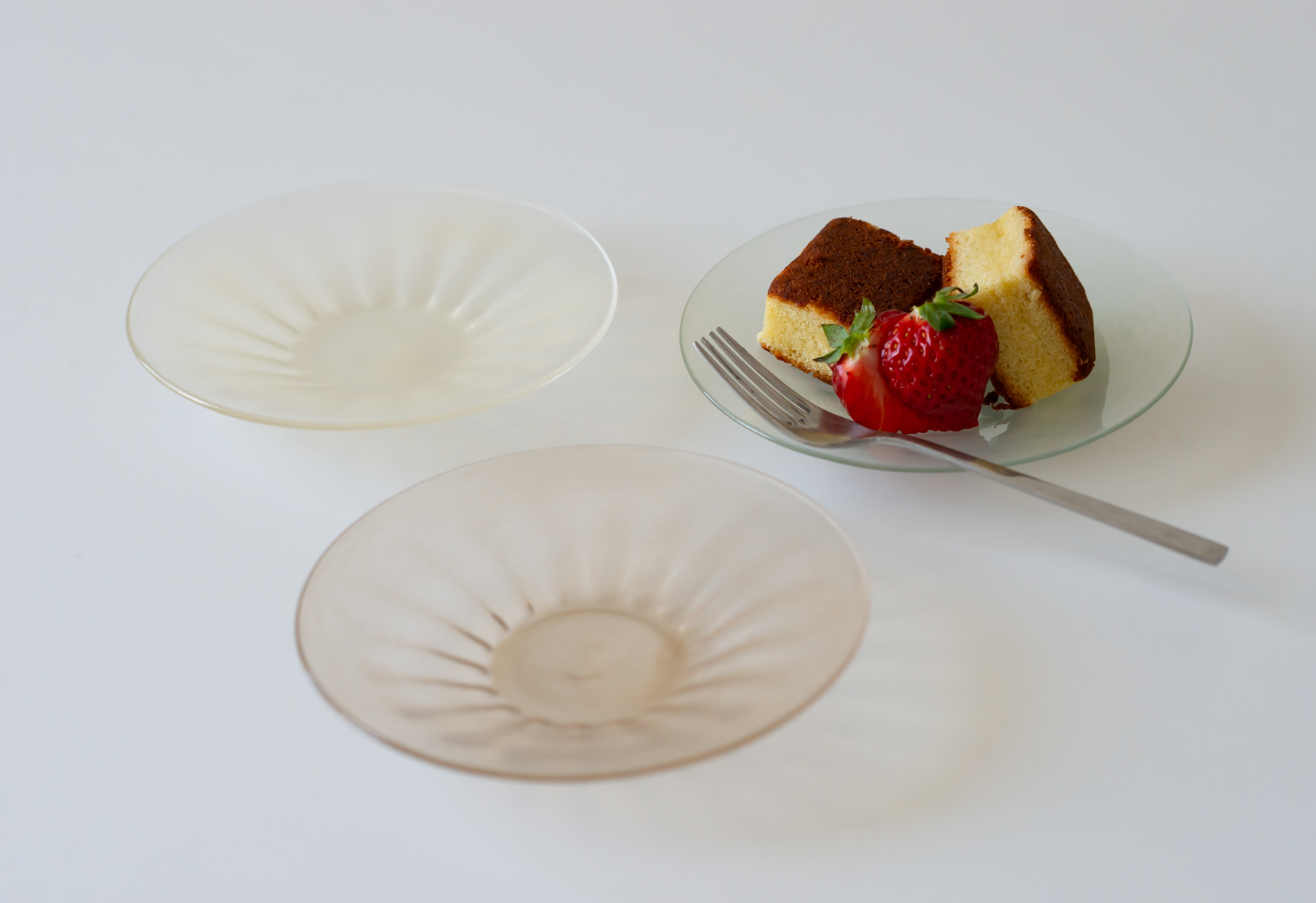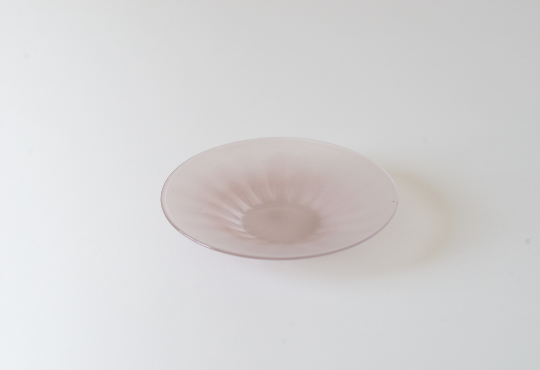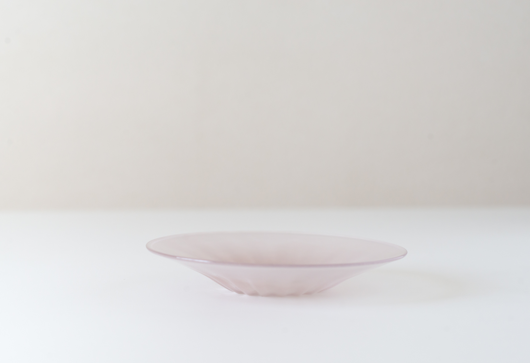 4.5寸皿は一般的な取り皿よりやや小さいくらいの大きさで、中心の5cmくらいはほぼフラット。そこから縁に向かって傾斜がついており、裏面のモール模様が色に濃淡をつけています。フルーツやデザート、和菓子などを載せるのにちょうど良いサイズ感で、同シリーズの細モール小鉢を置くとソーサーのようにも使っていただけます。
