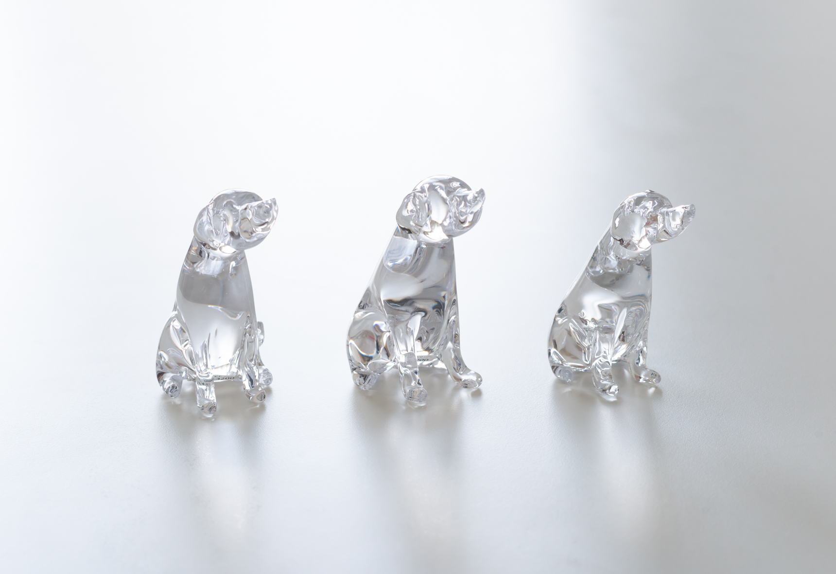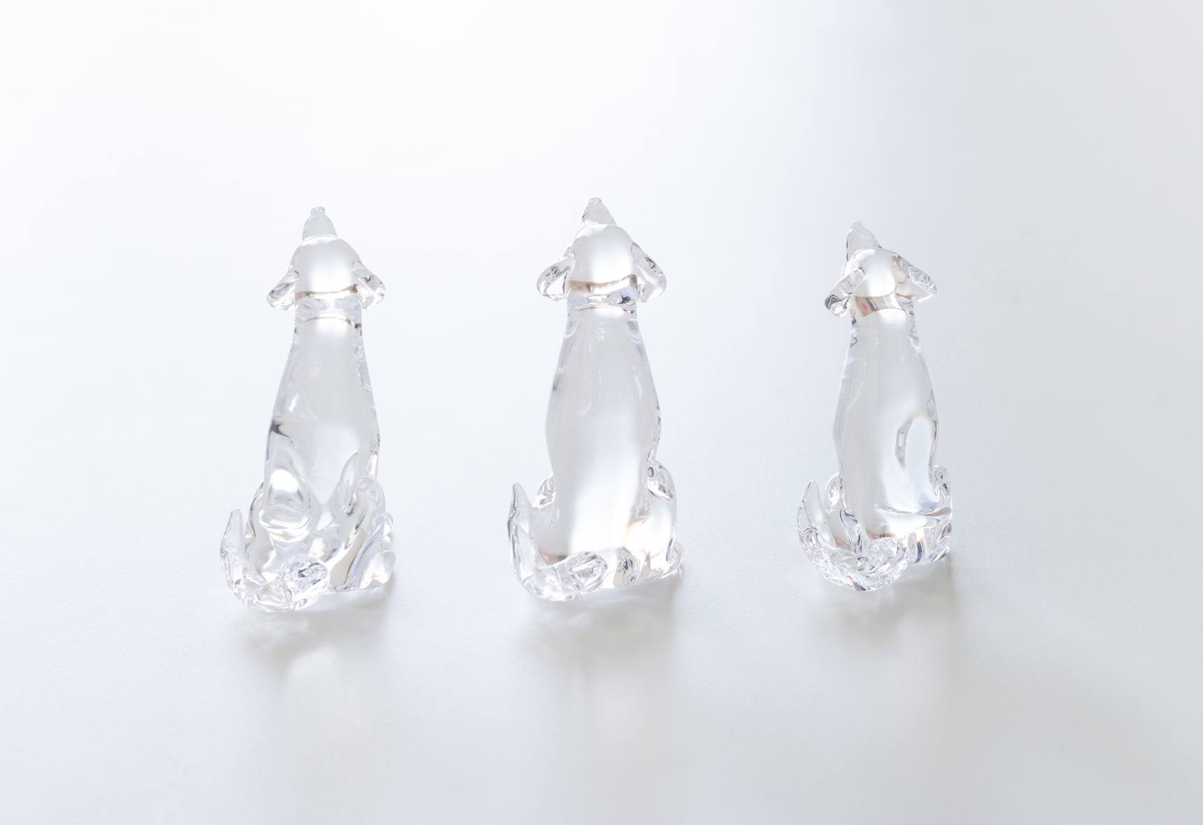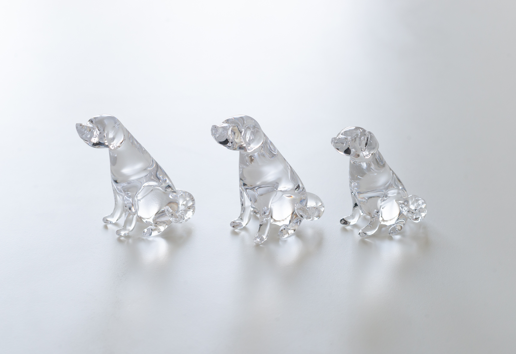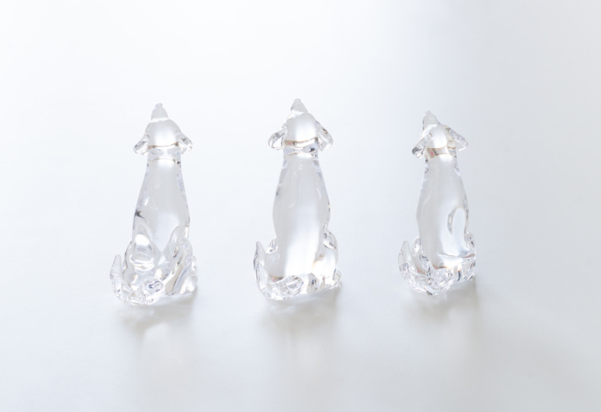 こちらの愛らしい犬のオブジェは、シンプルに透明なガラスだけで細部を表現した作品。耳、前足、尻尾の微妙な違いは、それぞれの犬の性格まで想像できそうな仕上がりです。