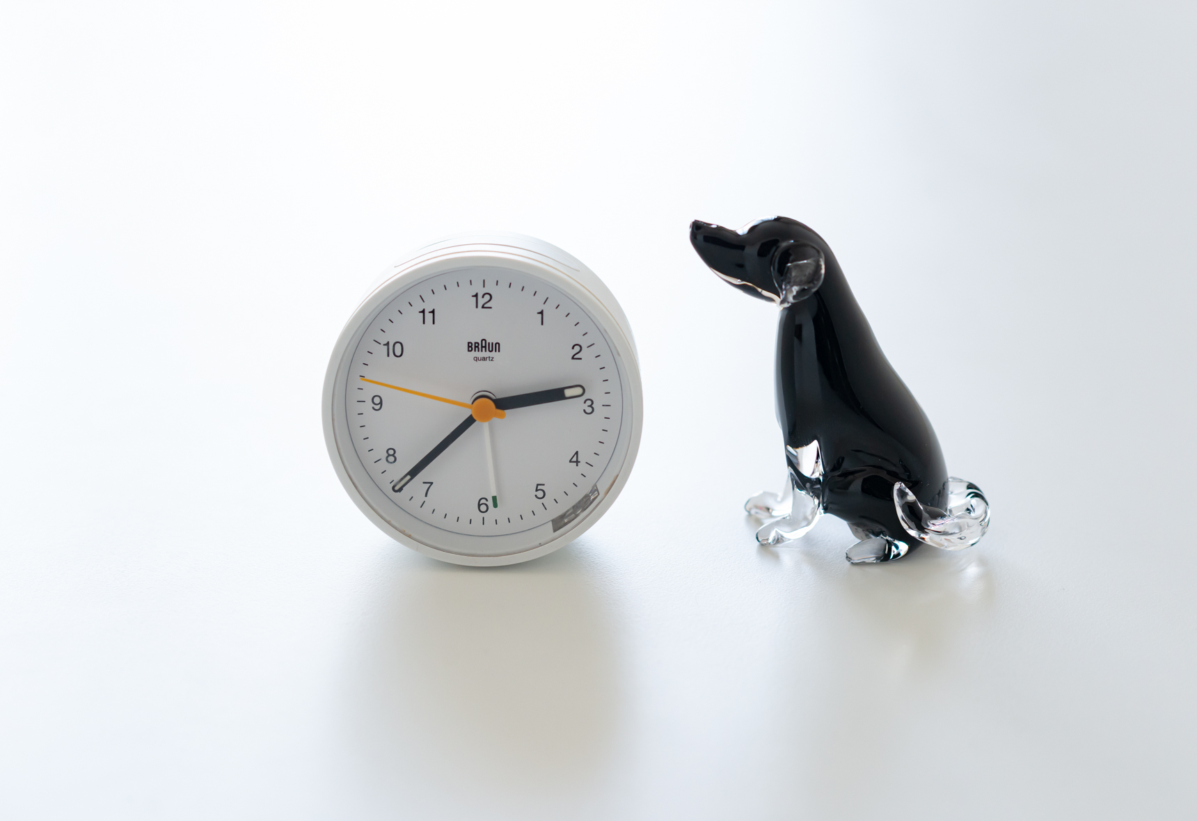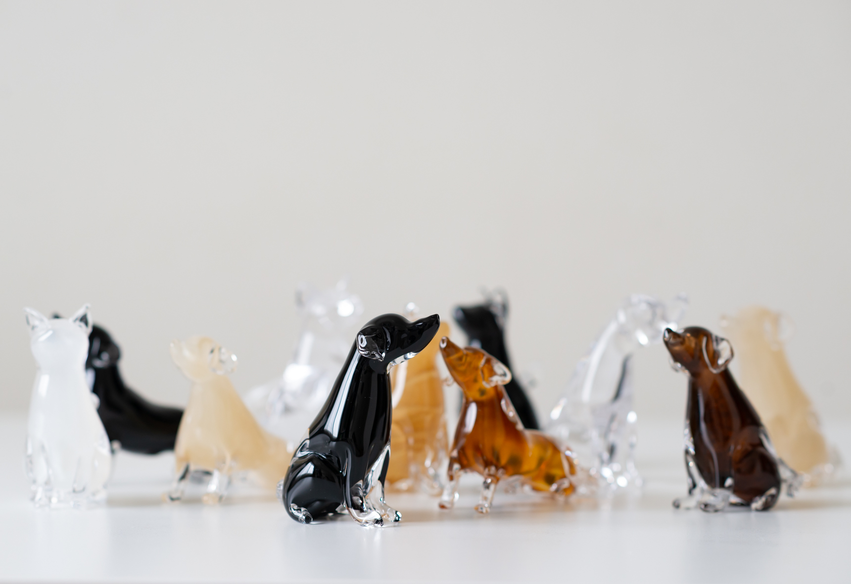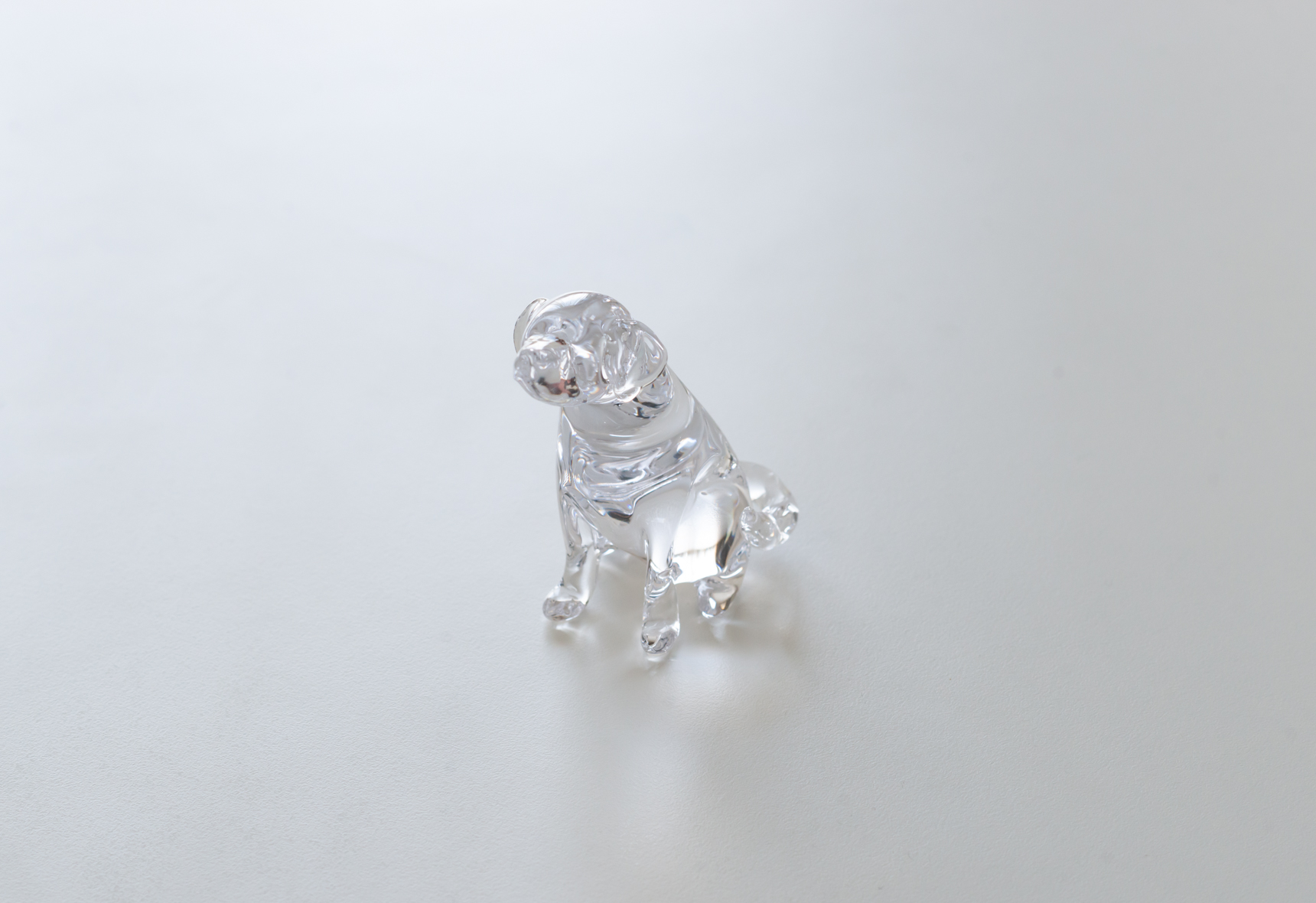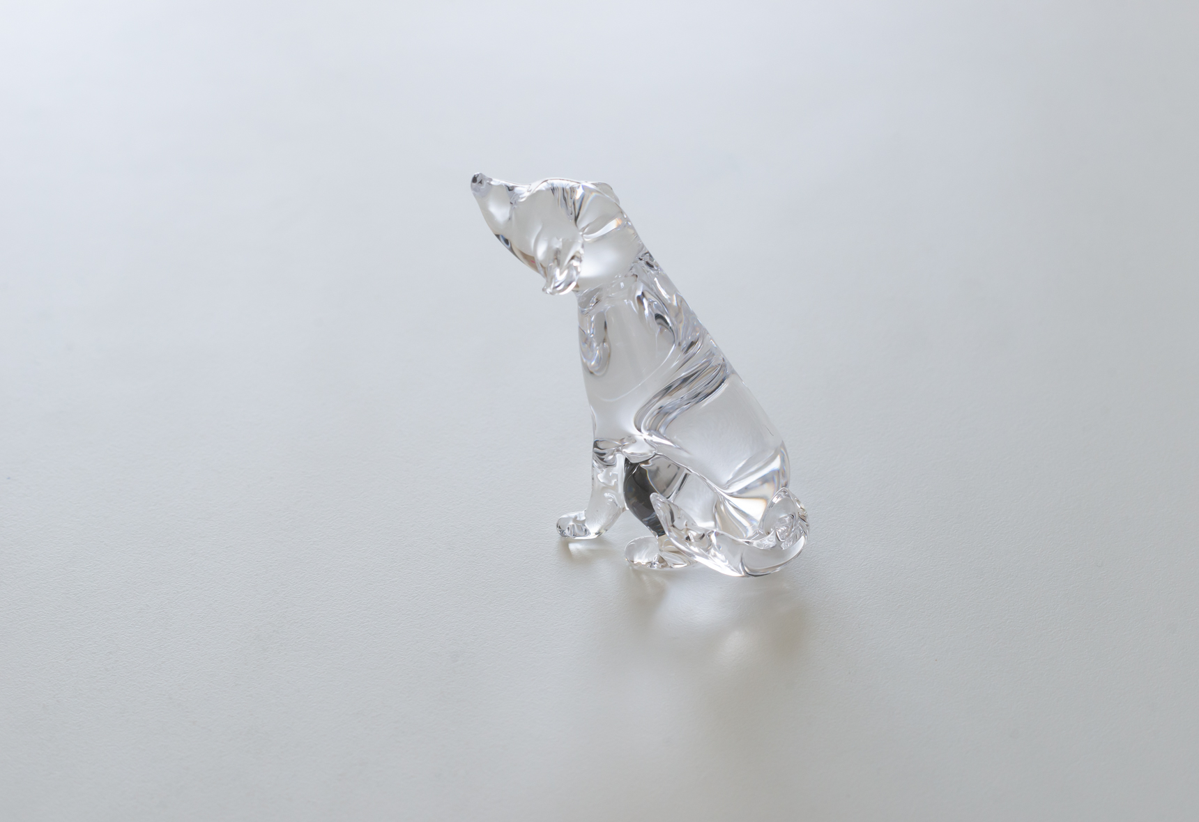 こちらの愛らしい犬のオブジェは、シンプルに透明なガラスだけで細部を表現した作品。耳、前足、尻尾の微妙な違いは、それぞれの犬の性格まで想像できそうな仕上がりです。
