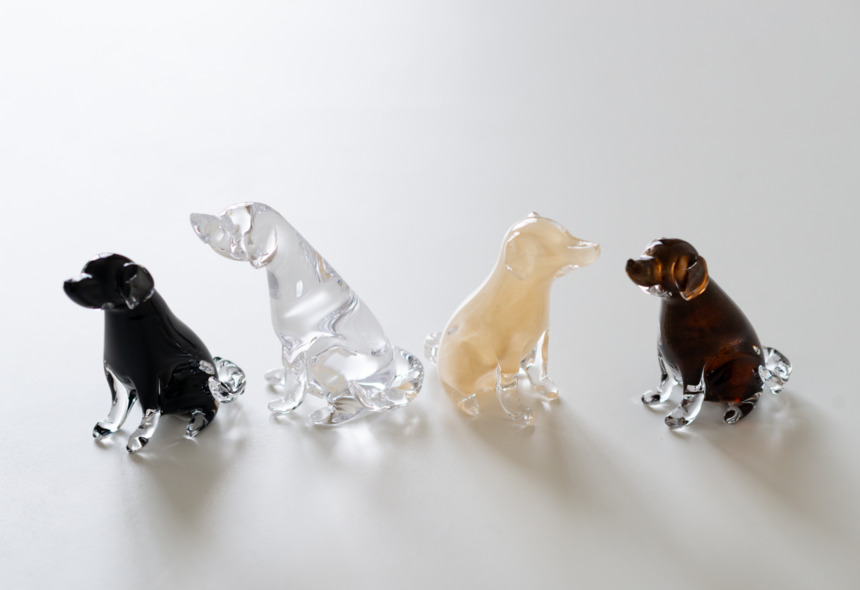お話しを聞くと、独立前に働かれていた大阪のガラス工房"Fresco"にもレトリバーがいたようで、その子を思い出しながら作るようになったとのこと。クリアは当初は制作されていなかったようですが、着色していない分ガラスの輝きを一番感じられる色味です。角度によって表情も違って見えるので、お気に入りの場所に飾って楽しんでください。