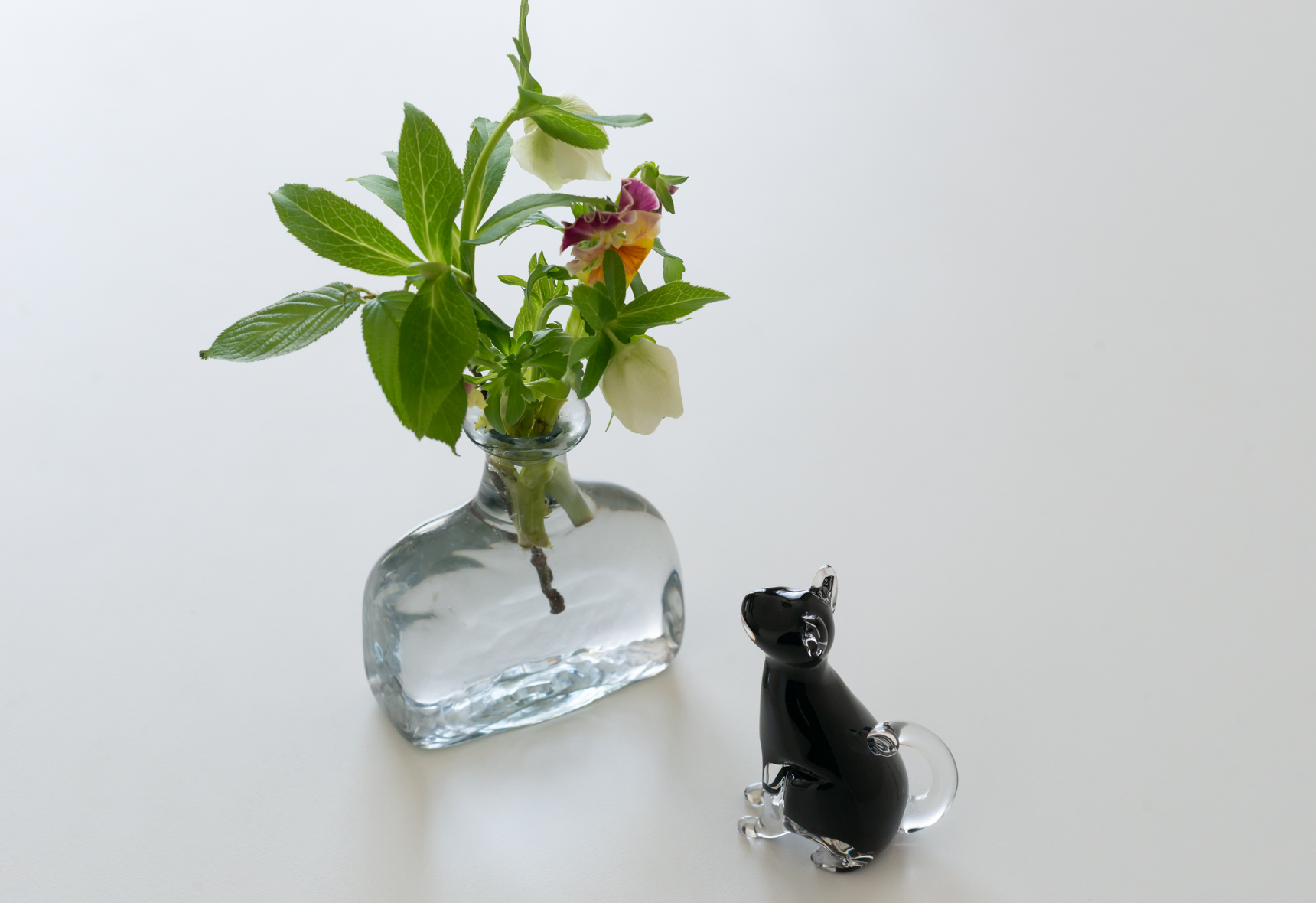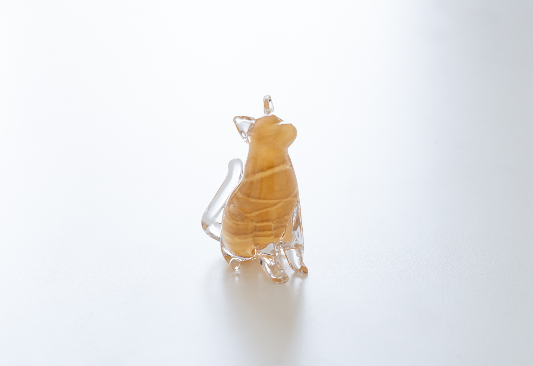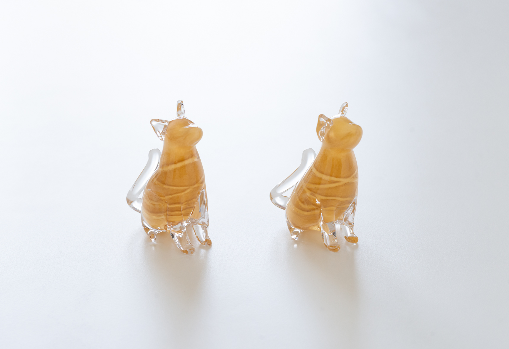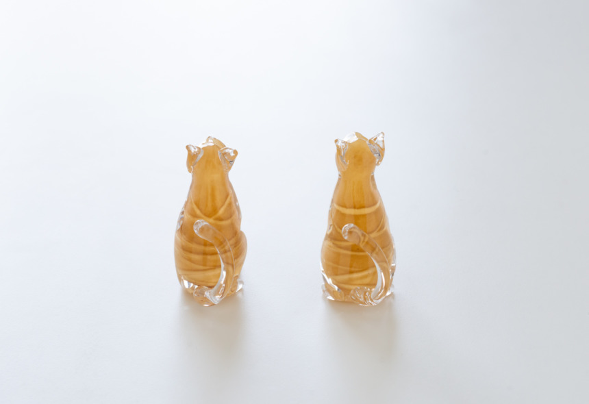 こちらの愛らしい猫のオブジェは、色をつけたガラスの上から透明なガラスで細部を表現した作品。耳、前足、長い尾っぽの微妙な違いは、それぞれ猫の性格まで想像できそうな仕上がりです。