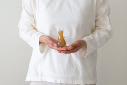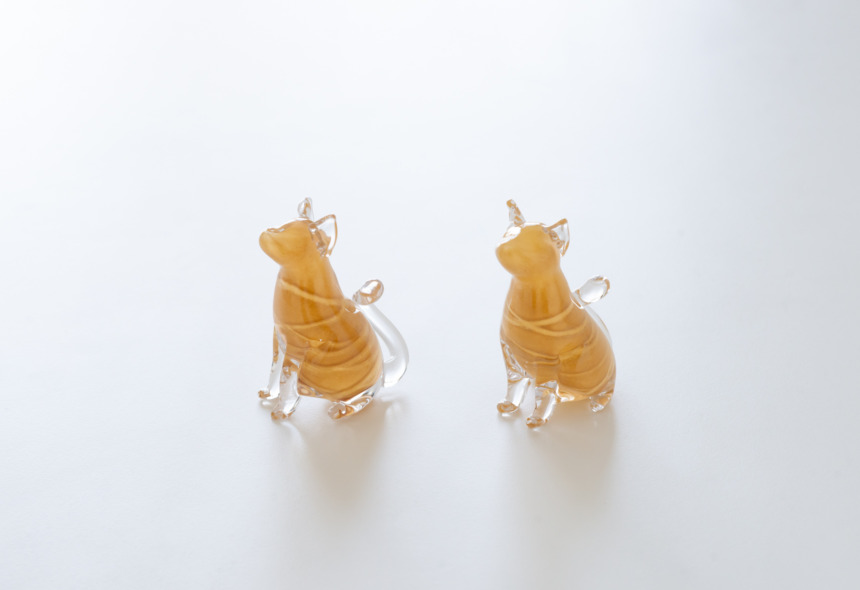 犬のオブジェの制作をする中で2023年から新たに登場した猫シリーズ。茶トラは他の色と違って縞模様を入れるため更にひと手間掛かっています。サイズは手のひらに収まるほどで、ホワイトと茶トラはうっすら光を透過します。角度によって表情も違って見えるので、お気に入りの場所に飾って楽しんでください。
