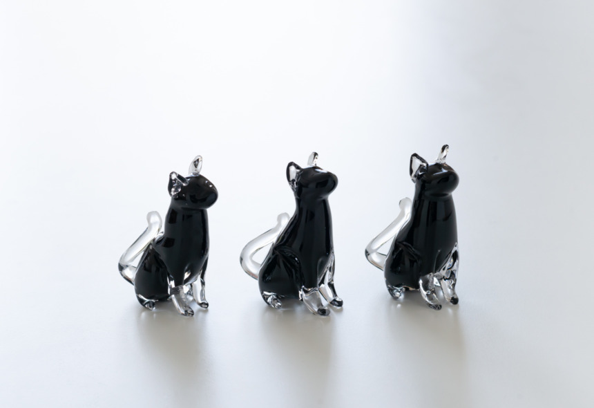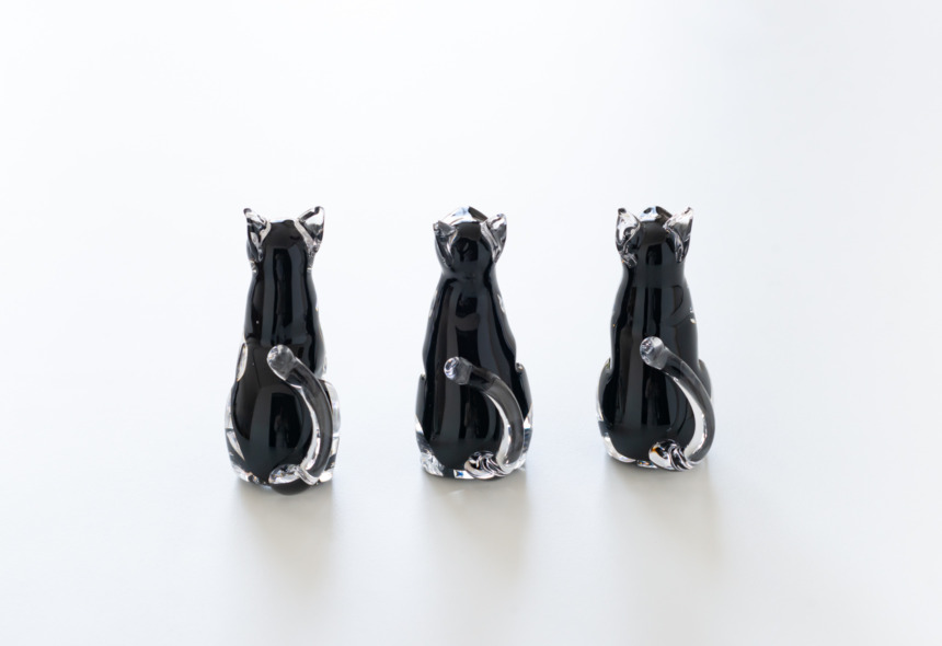 こちらの愛らしい猫のオブジェは、色をつけたガラスの上から透明なガラスで細部を表現した作品。耳、前足、長い尾っぽの微妙な違いは、それぞれ猫の性格まで想像できそうな仕上がりです。