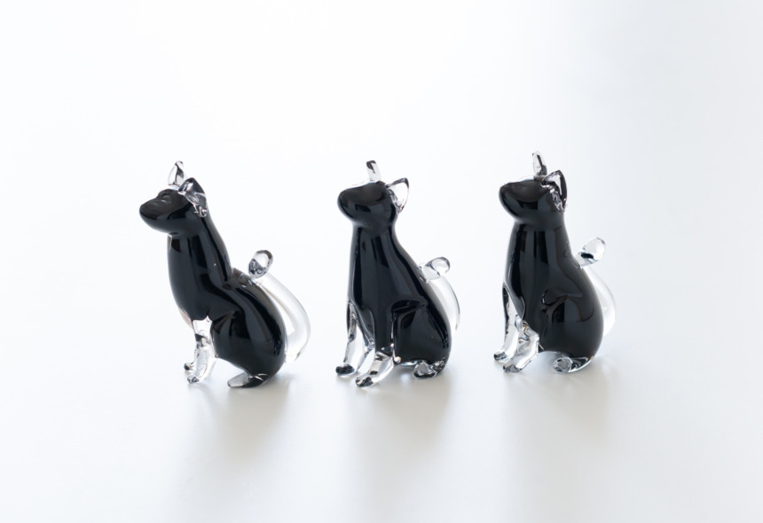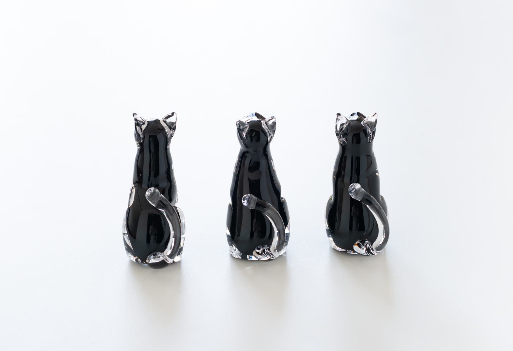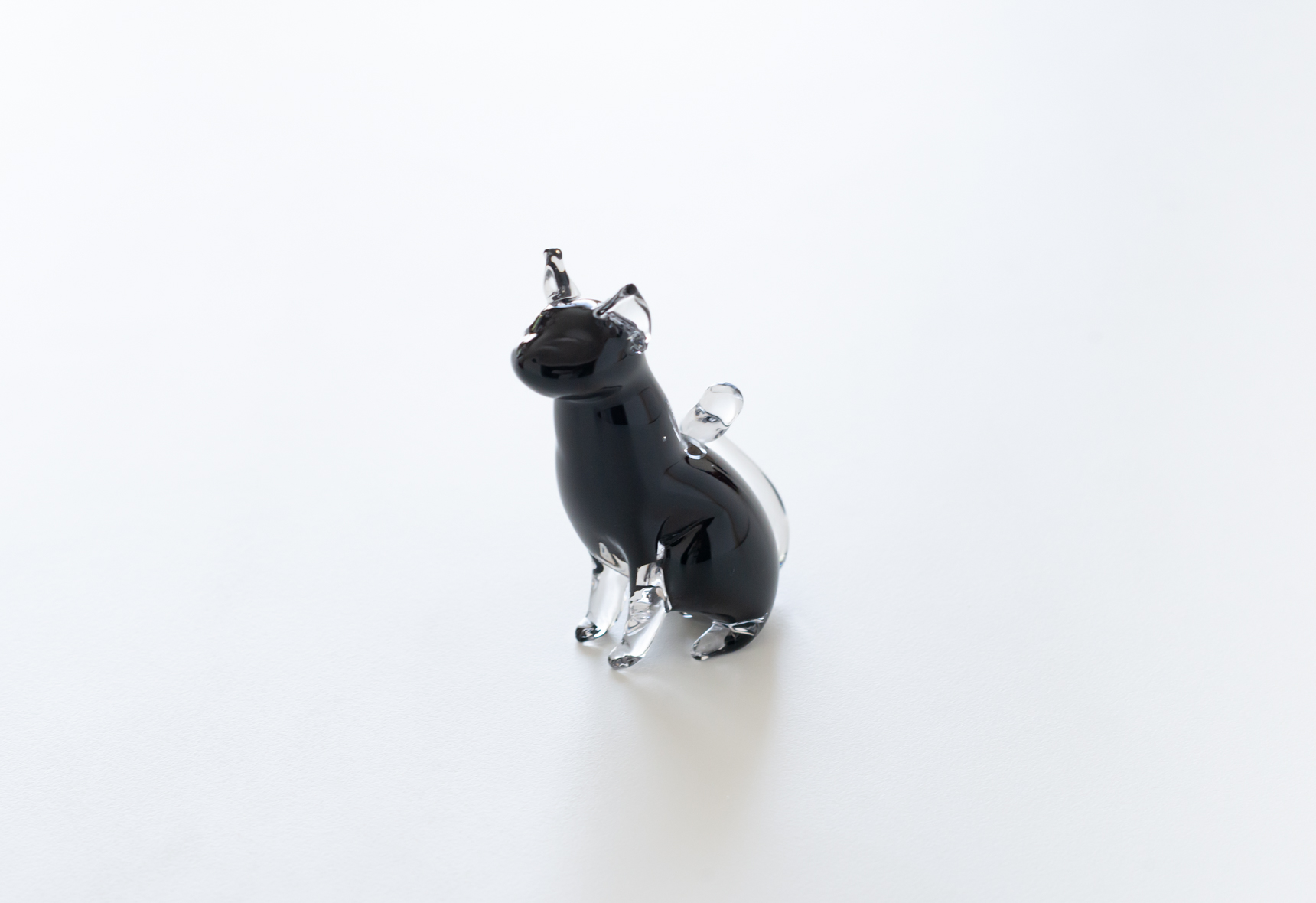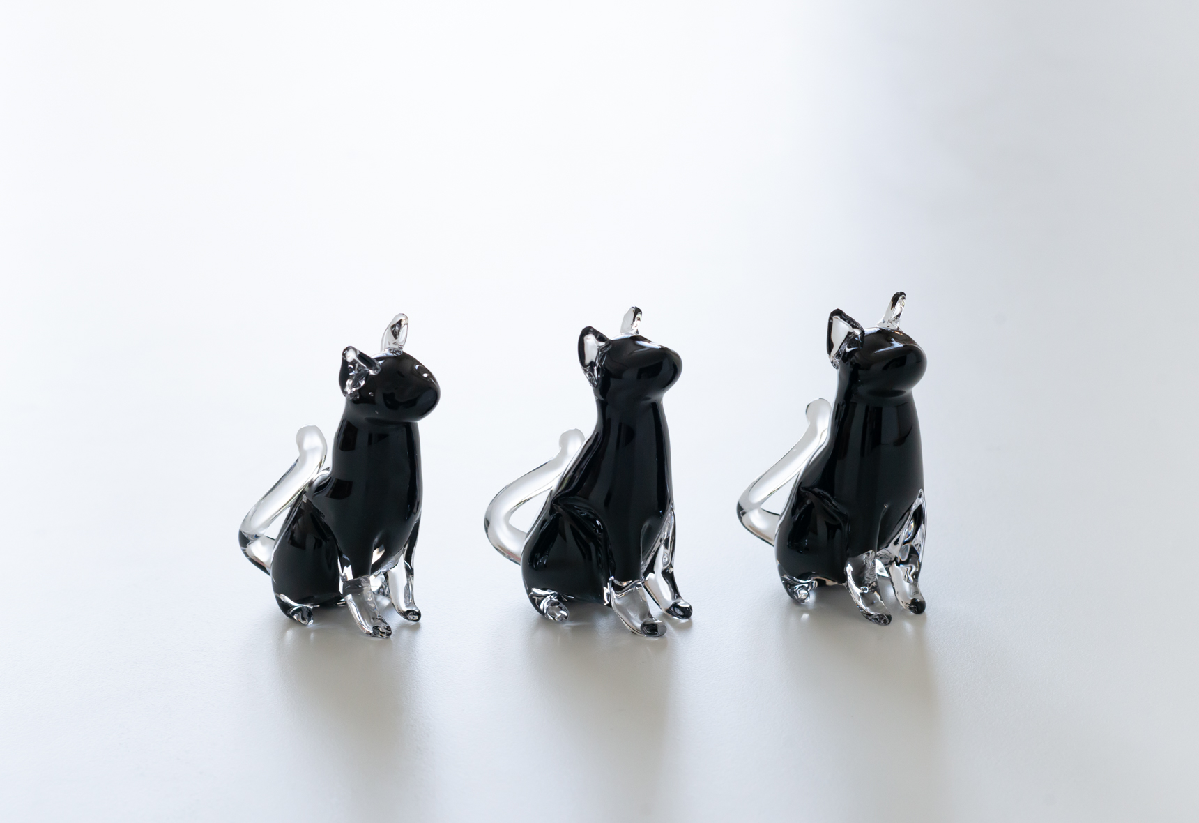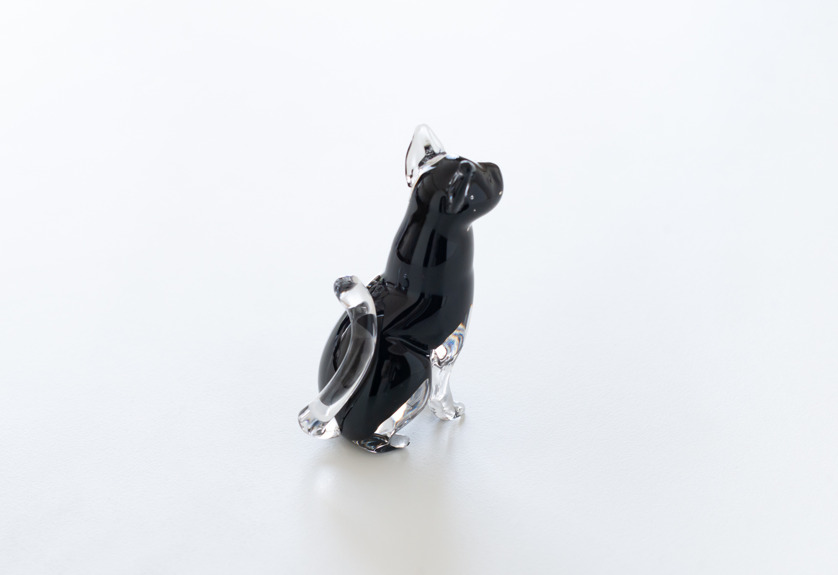 犬のオブジェの制作をする中で2023年から新たに登場した猫シリーズ。サイズは手のひらに収まるほどで、内側の黒は光を透過しませんが、外側を覆うクリアガラスによって、つるりとした美しい艶を感じられます。角度によって表情も違って見えるので、お気に入りの場所に飾って楽しんでください。